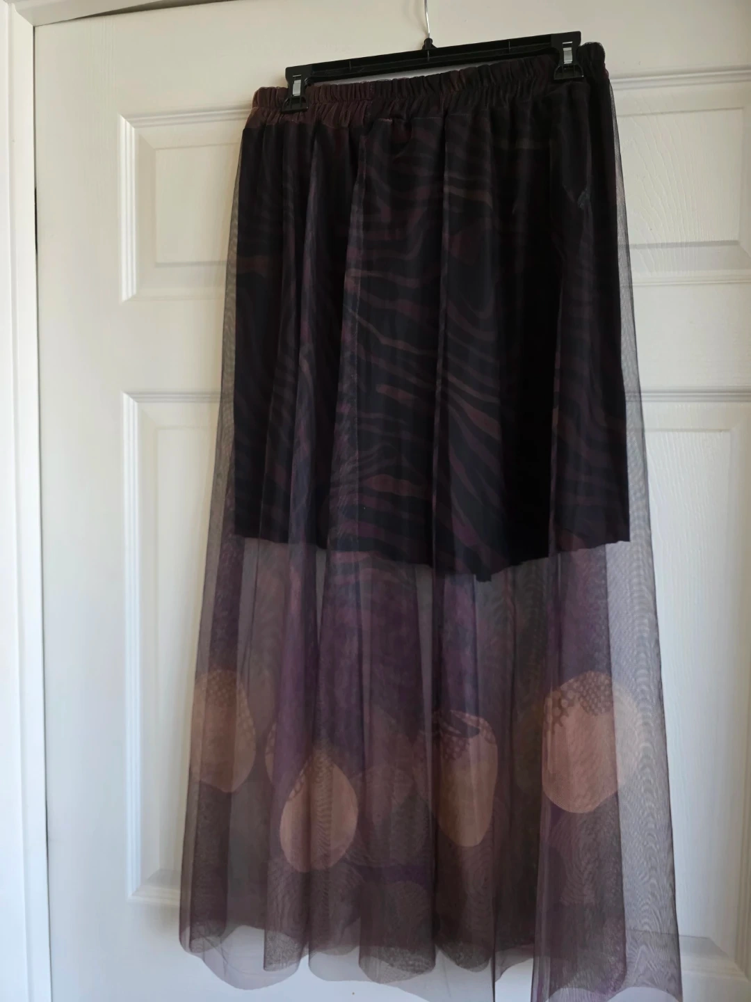 This is a women's midi skirt with a sheer tulle overlay. It features a black and purple zebra-like print on the opaque underlayer and a gradient print with circular motifs on the sheer portion. Elastic waistband for comfort. Material: Polyester.