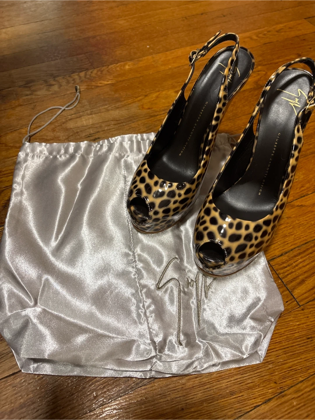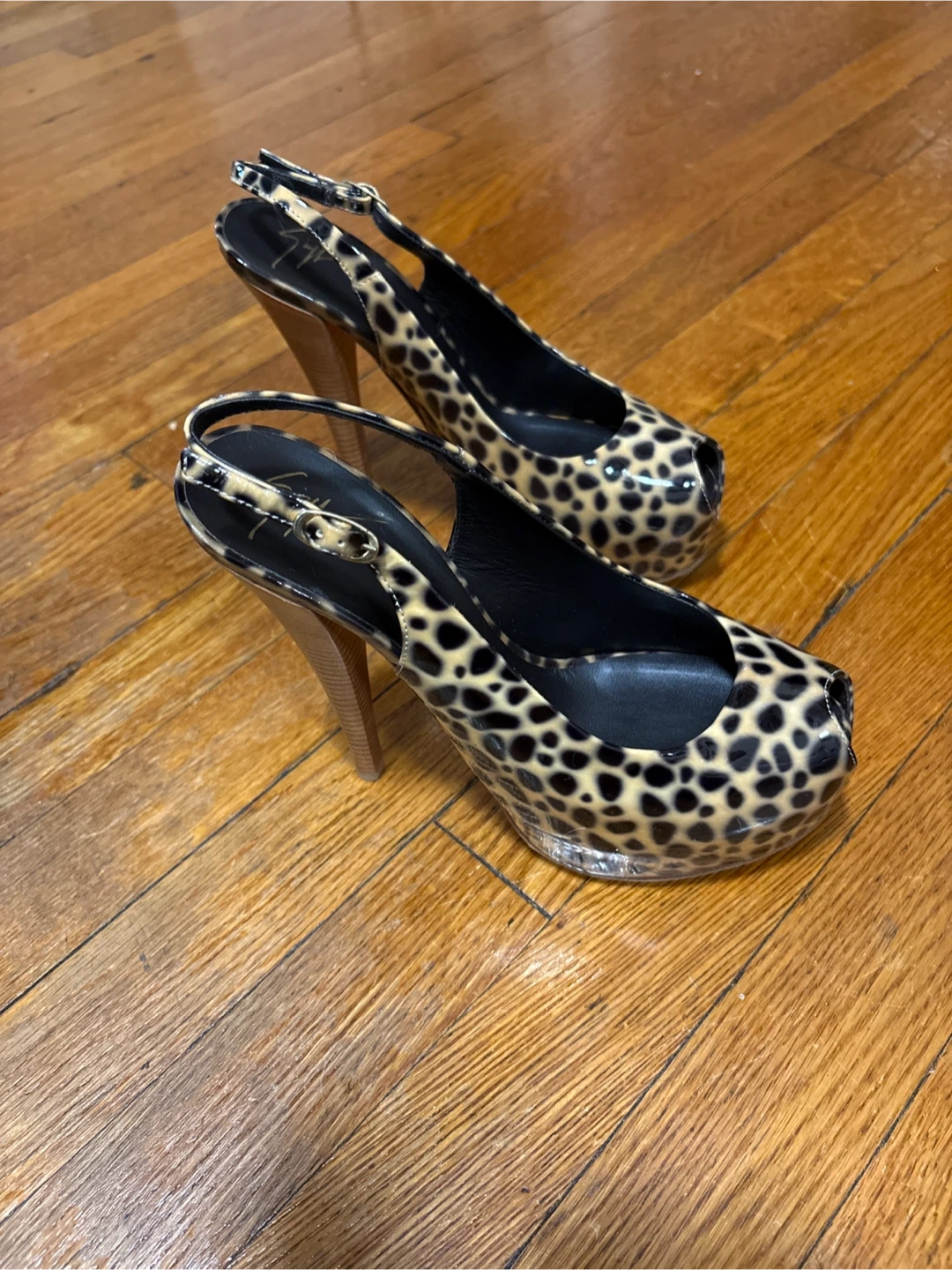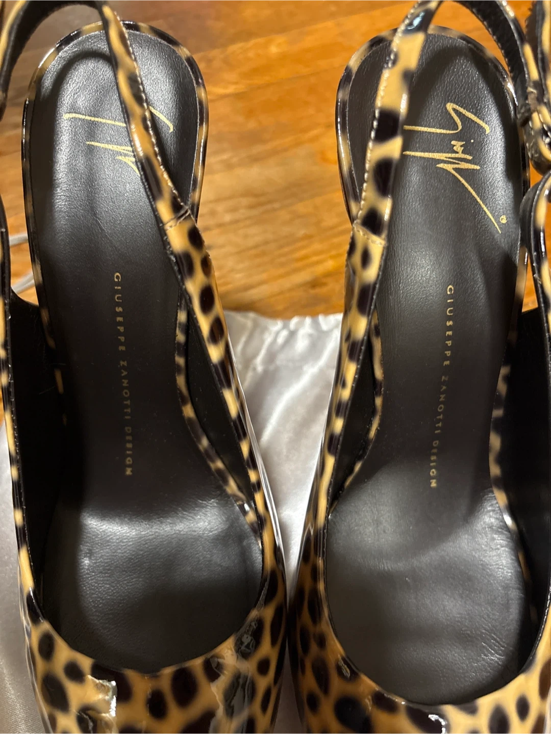 These Giuseppe Zanotti platform heels feature a fun leopard print. They have a slingback strap and a peep toe design. Comes with original duster bag. Perfect for adding a pop of style to any outfit!