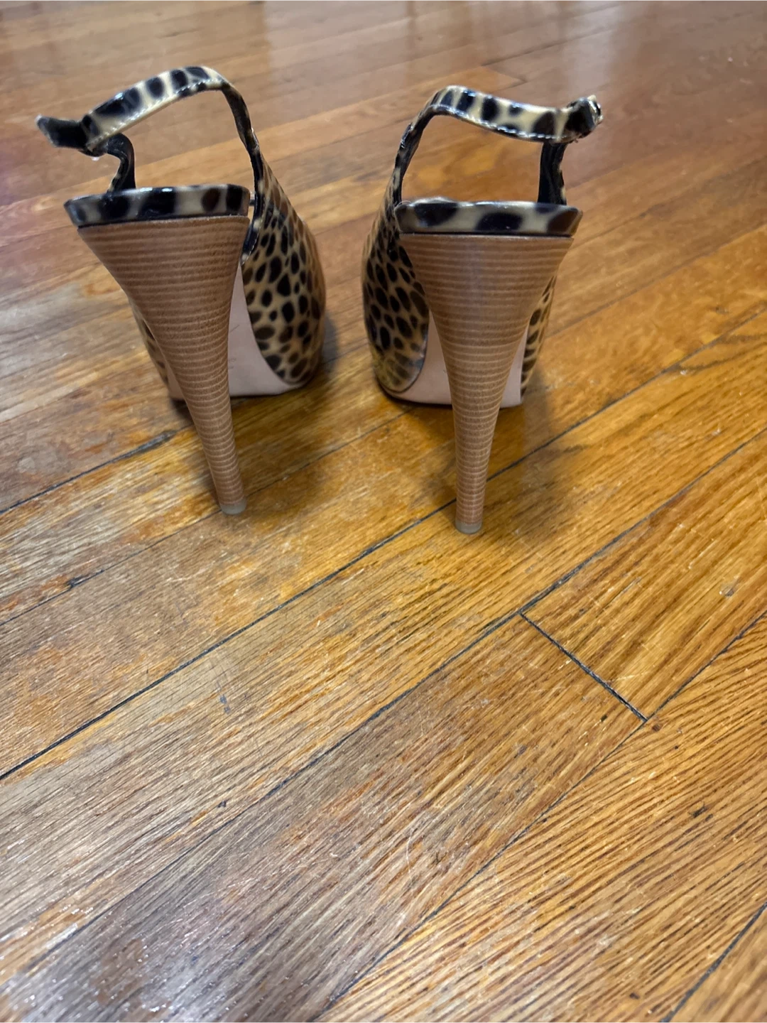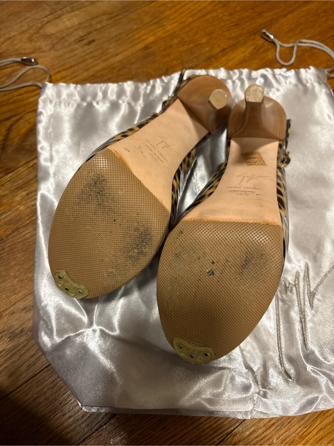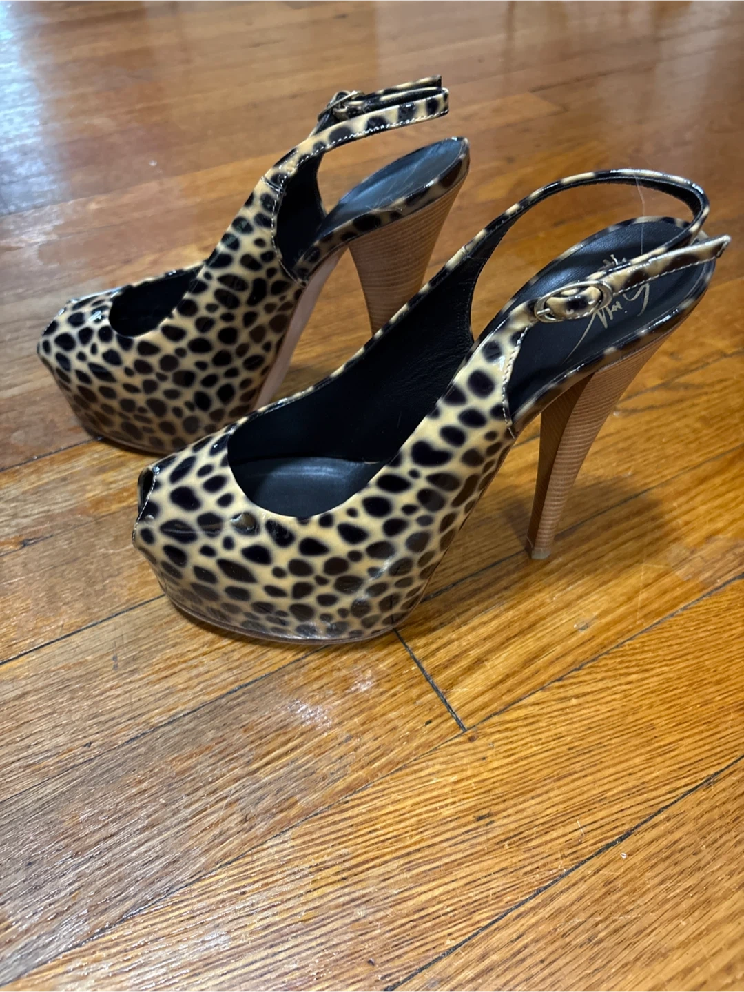 These Giuseppe Zanotti platform heels feature a fun leopard print. They have a slingback strap and a peep toe design. Comes with original duster bag. Perfect for adding a pop of style to any outfit!