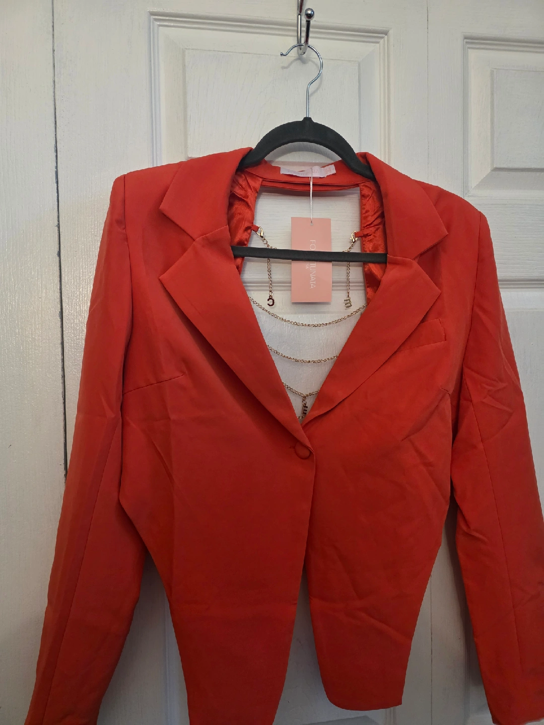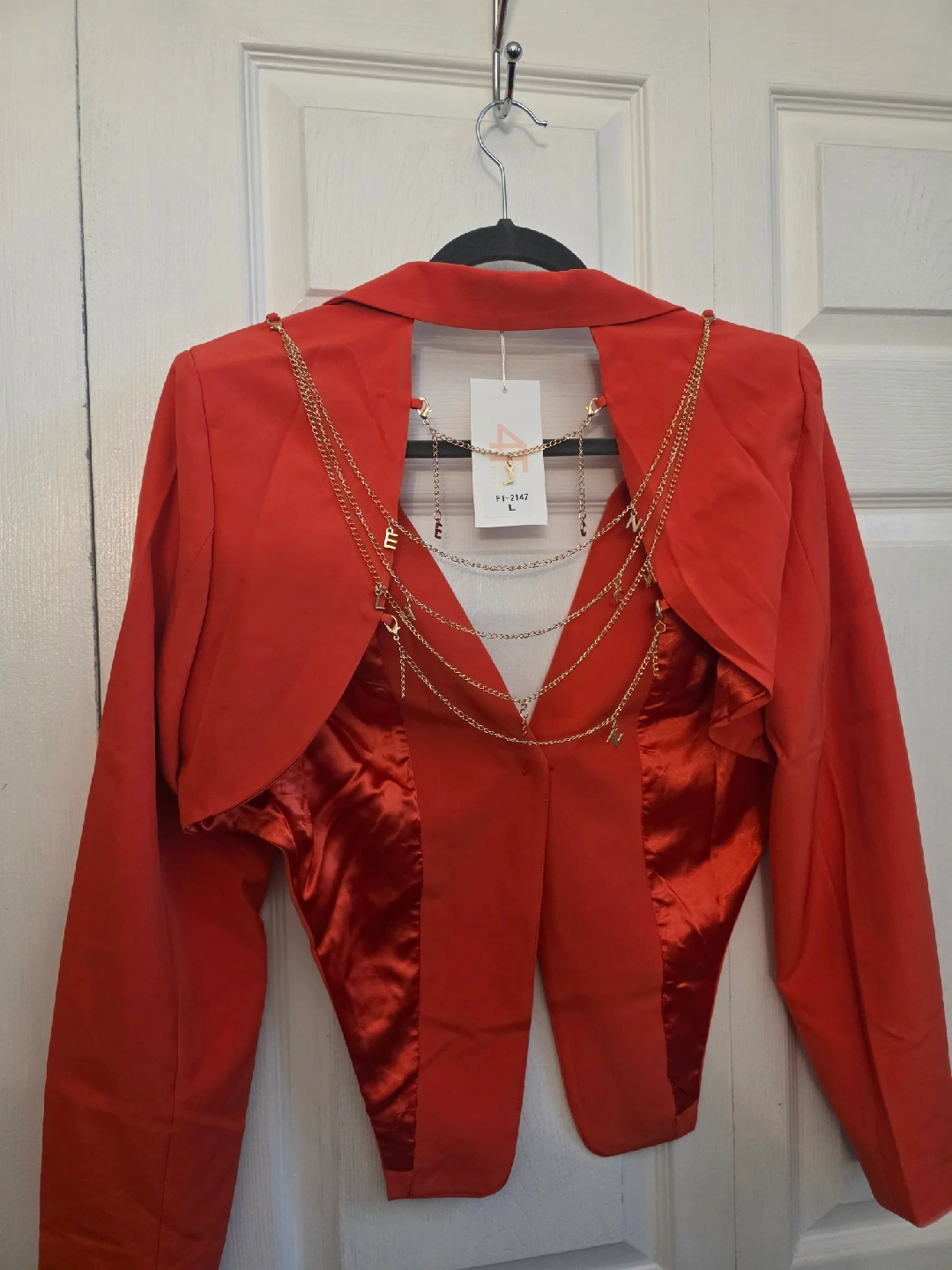 Selling a stylish orange blazer jacket in size L. The jacket features a unique design with chain detailing. It's new with tags and perfect for adding a pop of color to your wardrobe