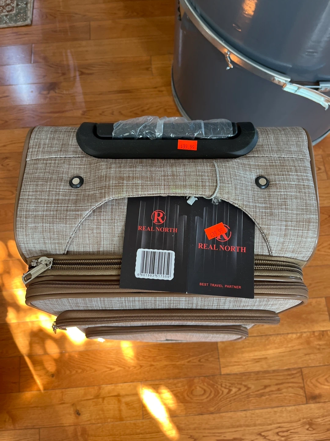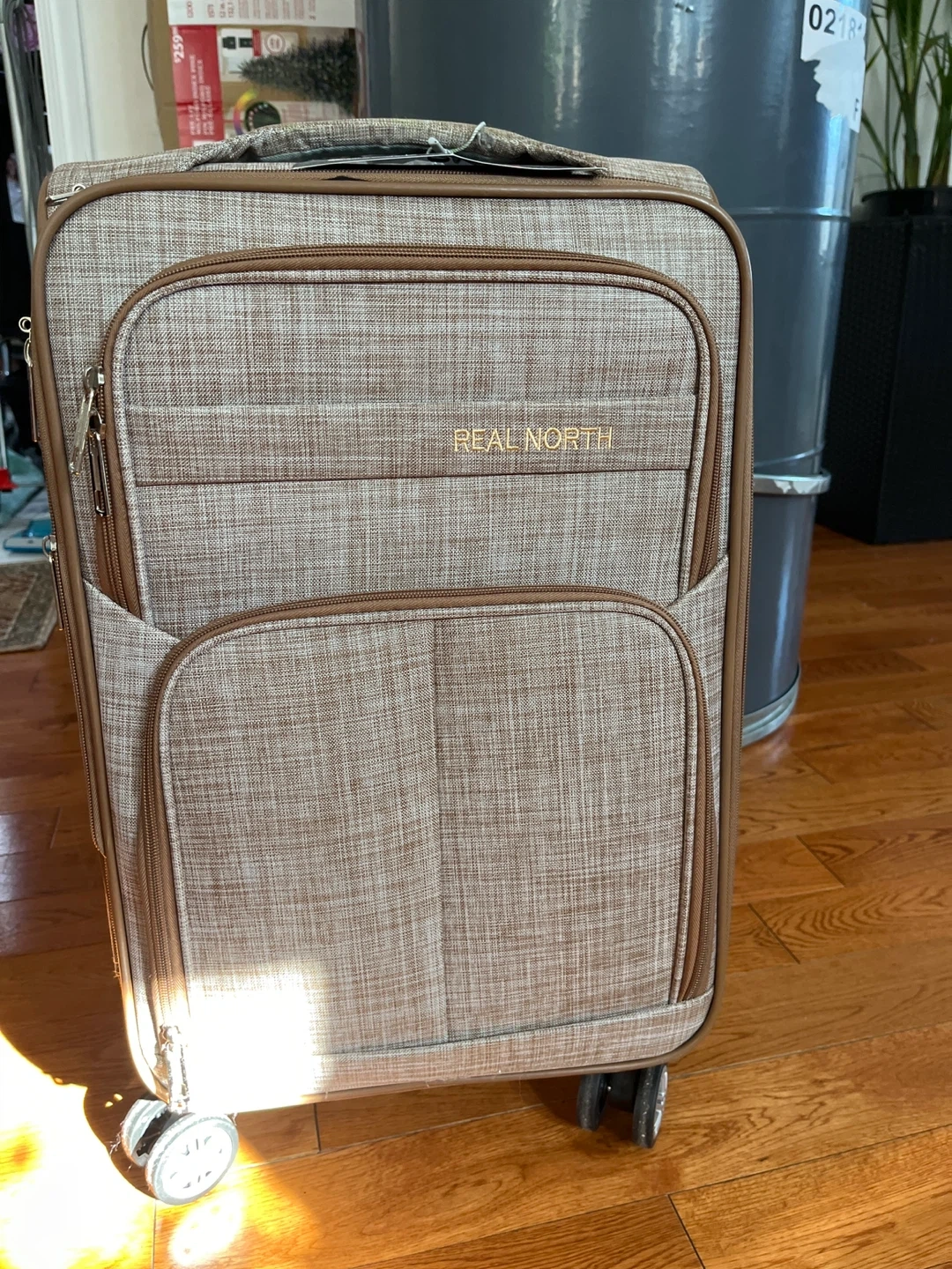 This is a Real North carry-on suitcase. It's a great travel partner for your trips! Features a durable fabric exterior with brown trim and zippered compartments. Perfect for short getaways.