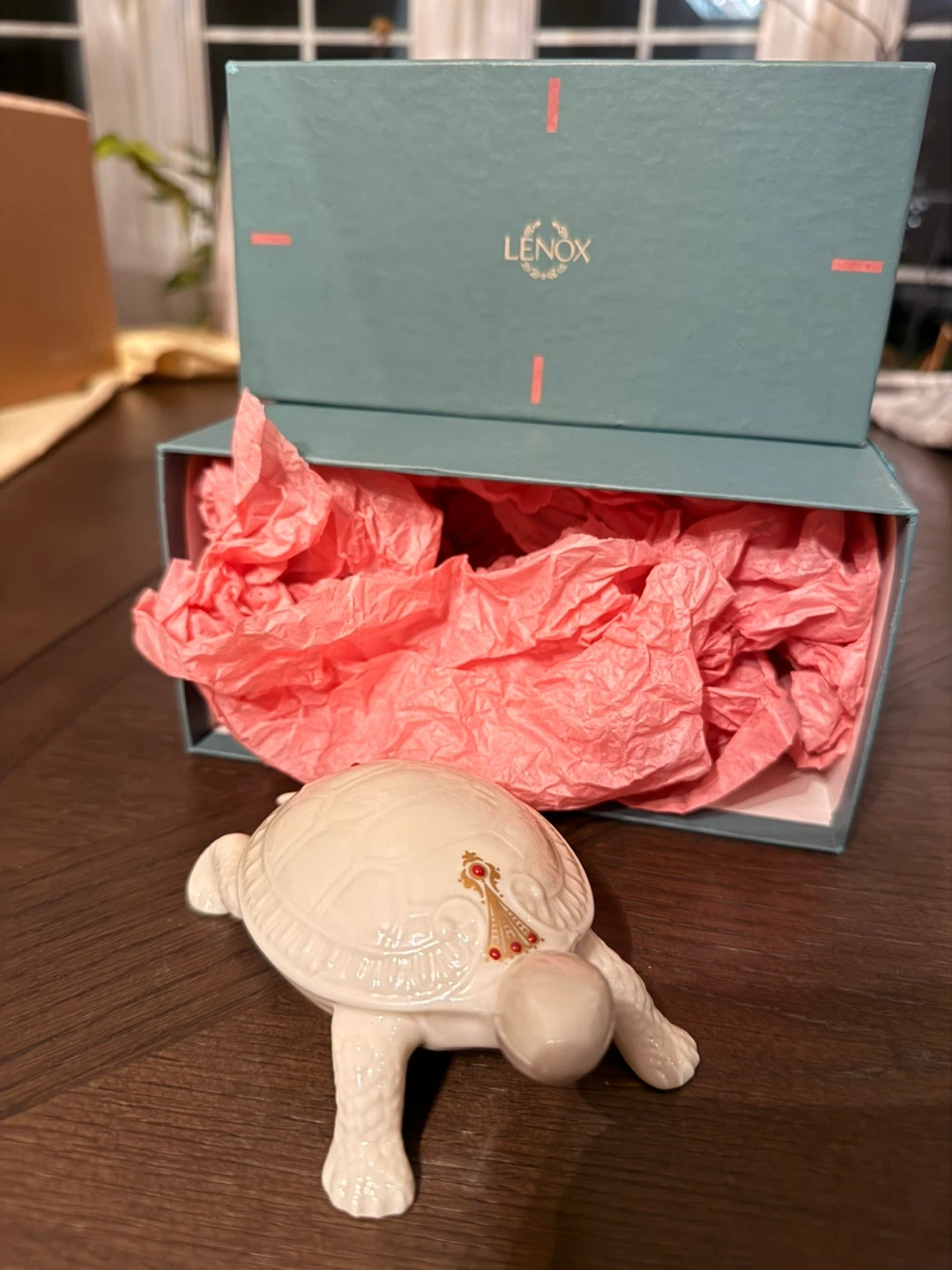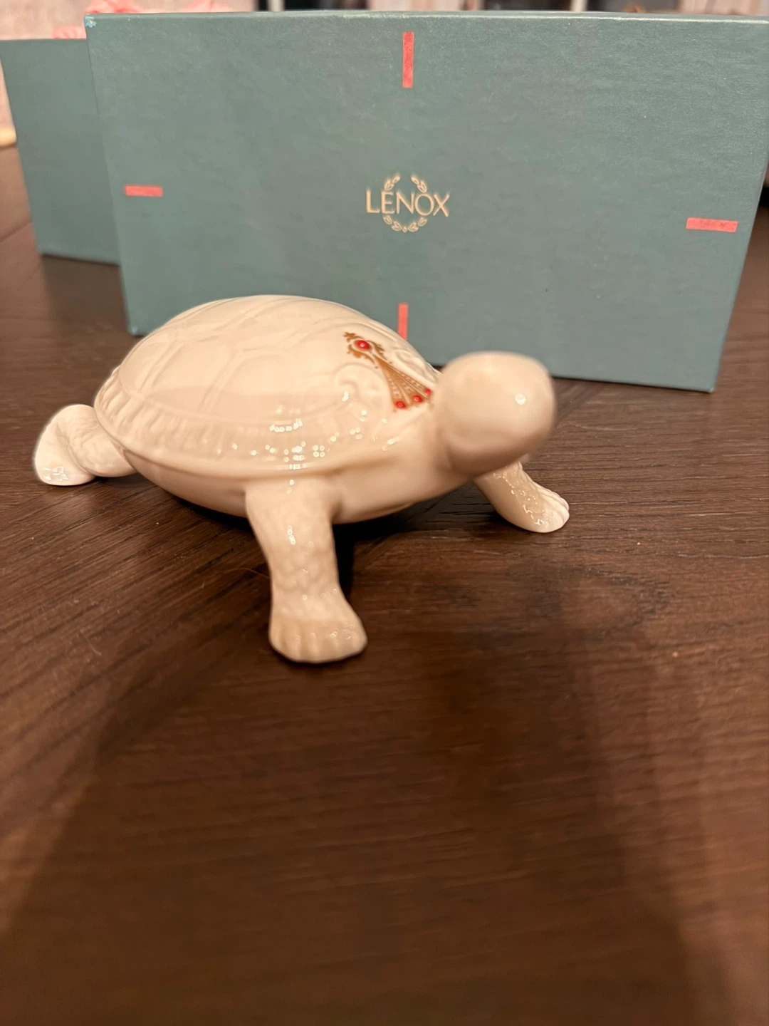 This is a charming Lenox porcelain turtle trinket dish. It features a detailed design with gold and red accents on its shell. The dish is perfect for holding small jewelry or keepsakes. Includes original box and pink tissue paper.