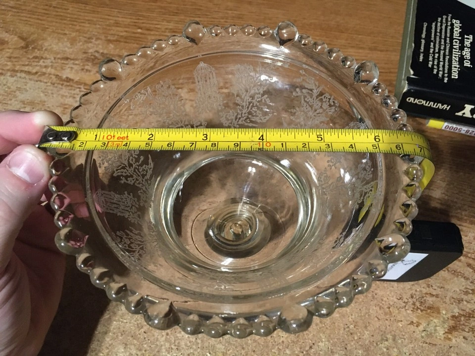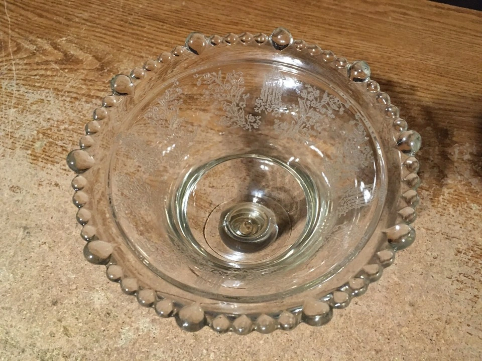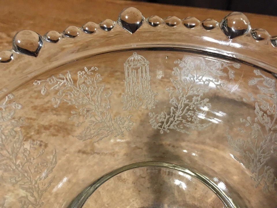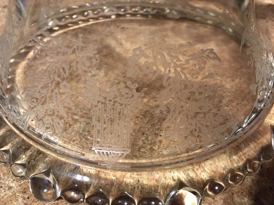 Selling a lovely vintage glass candy dish. It features an etched design with birdcages and floral patterns around the rim. The dish has a beaded edge and a pedestal base. Perfect for adding a touch of vintage charm to your home! very good condition about 6.5 in across 6.25 tall. pick up at house.