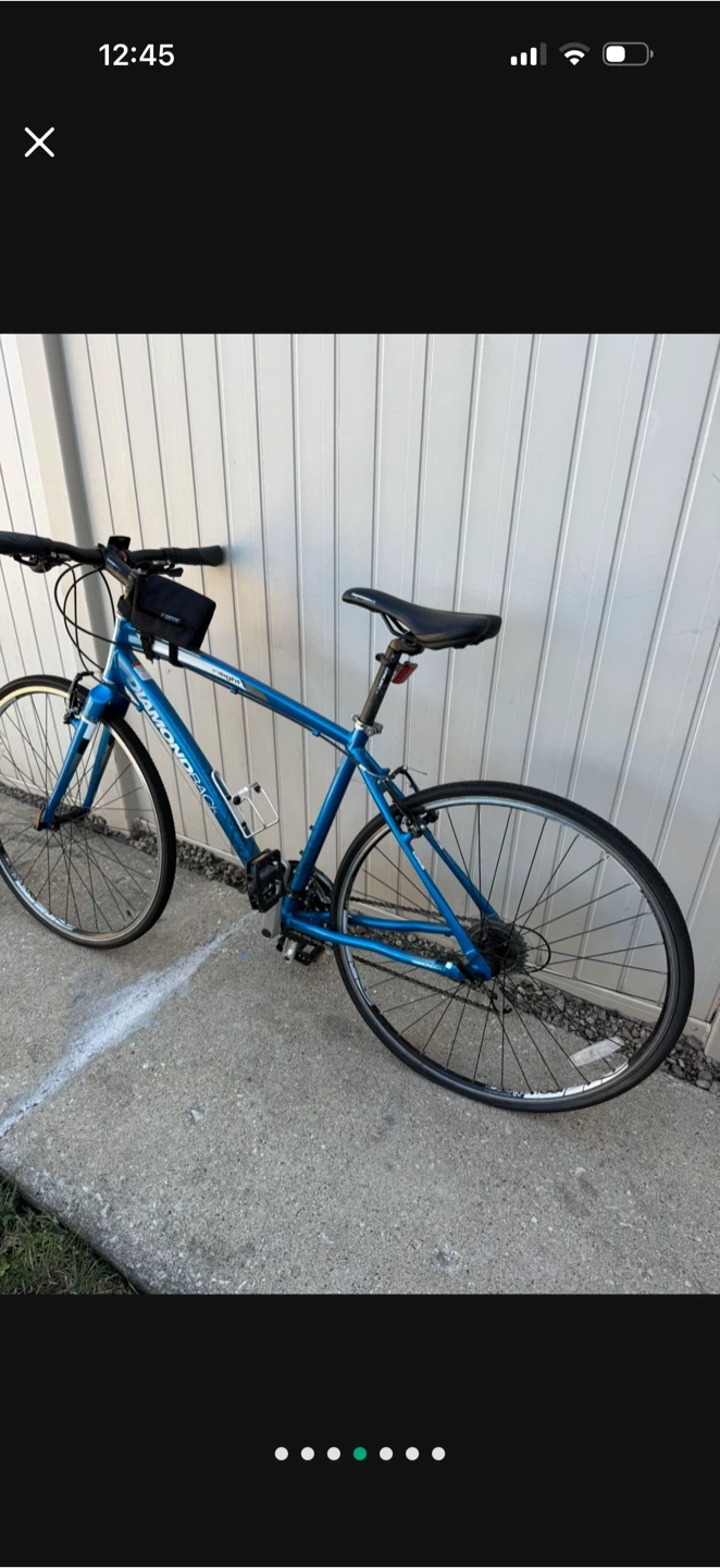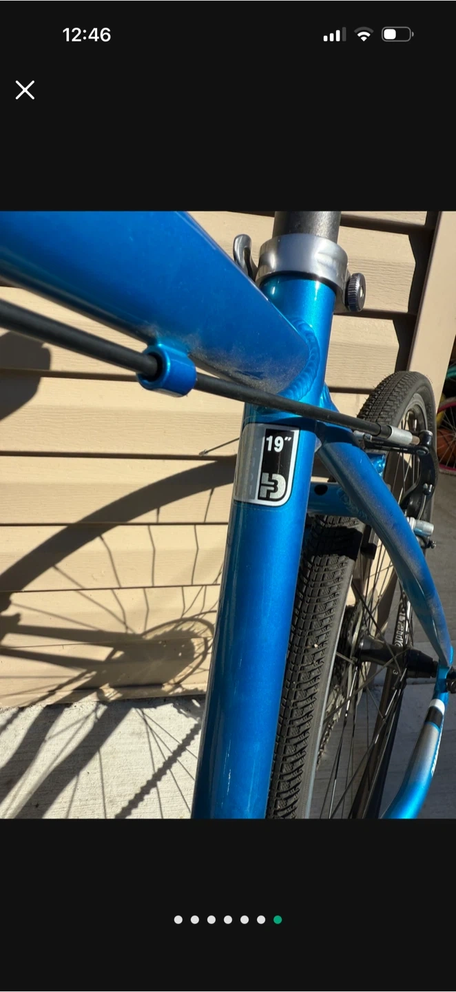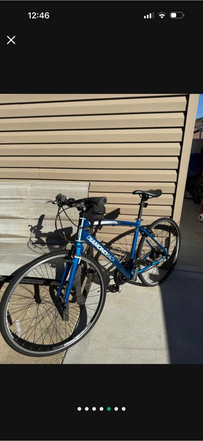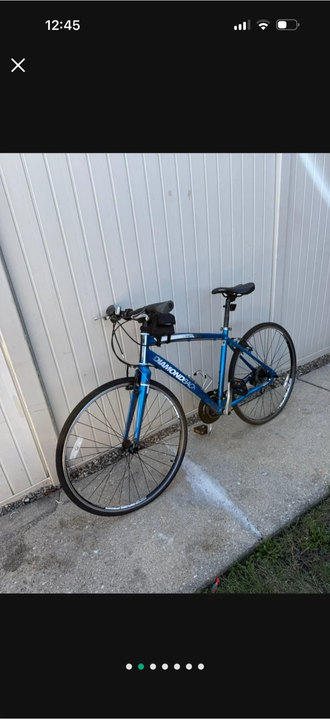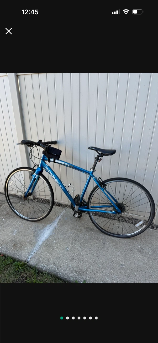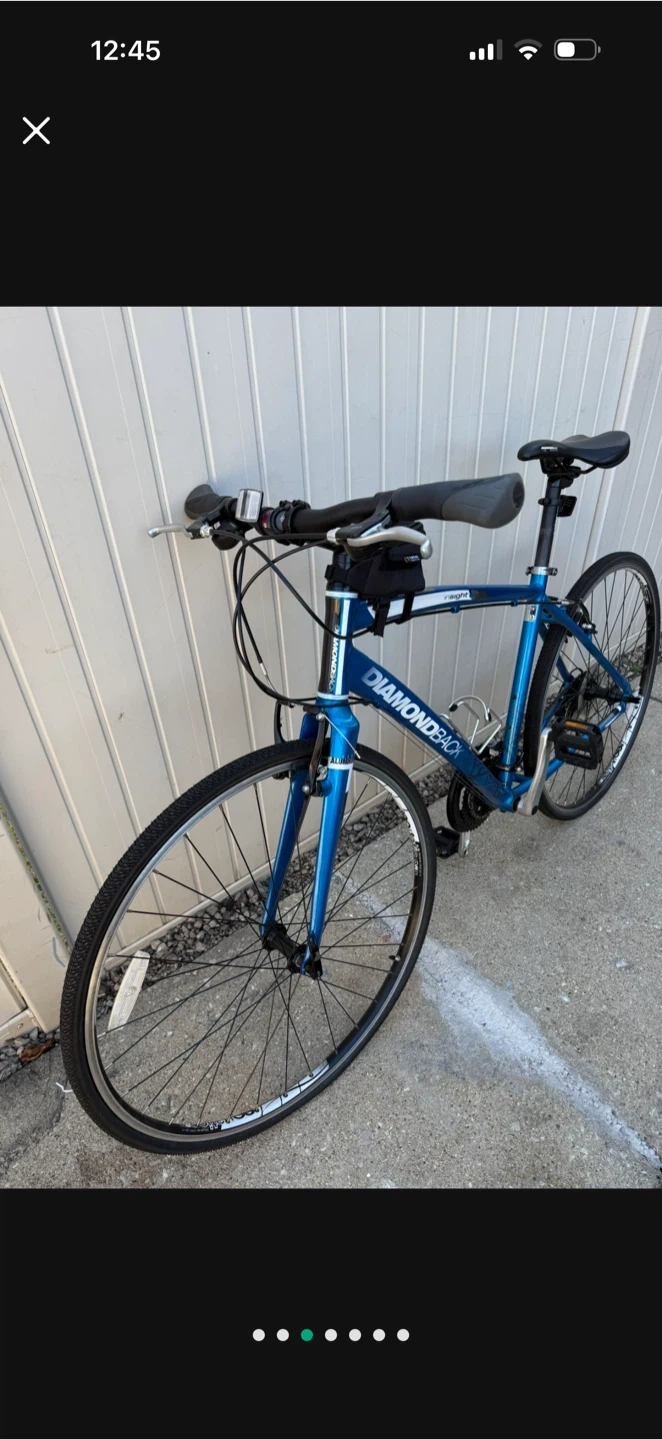 This is a blue Diamondback hybrid bike. It has a lightweight frame and comfortable riding position. Comes with a small pouch attached to the handlebars.