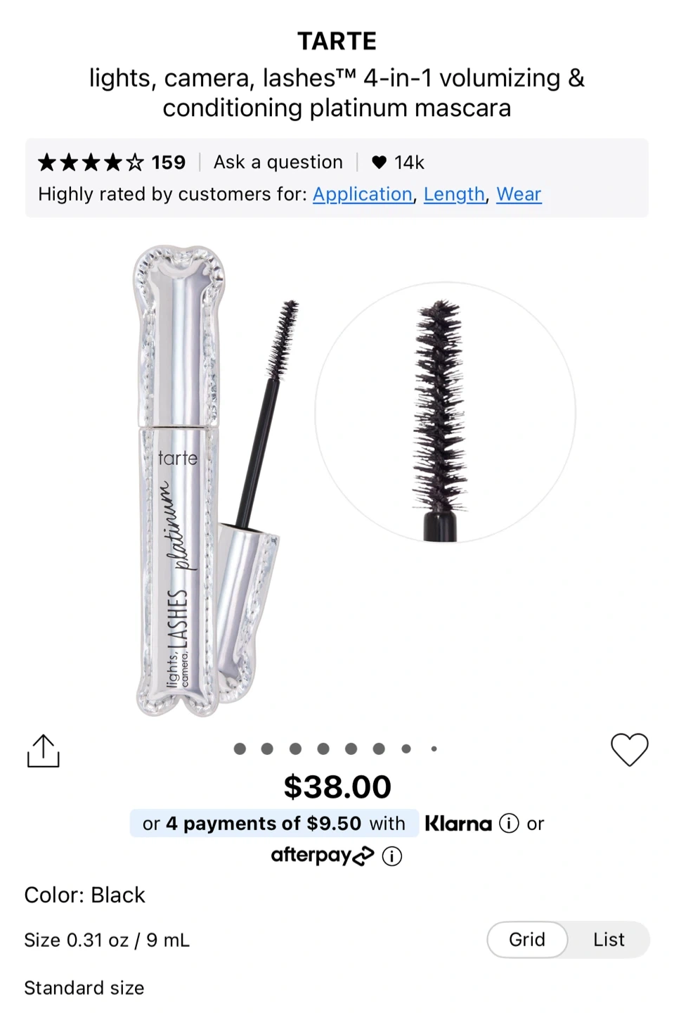 This Tarte mascara offers a 4-in-1 volumizing and conditioning formula. It's in a black shade and comes in a 0.31 oz / 9 mL size. Perfect for achieving fuller-looking lashes!