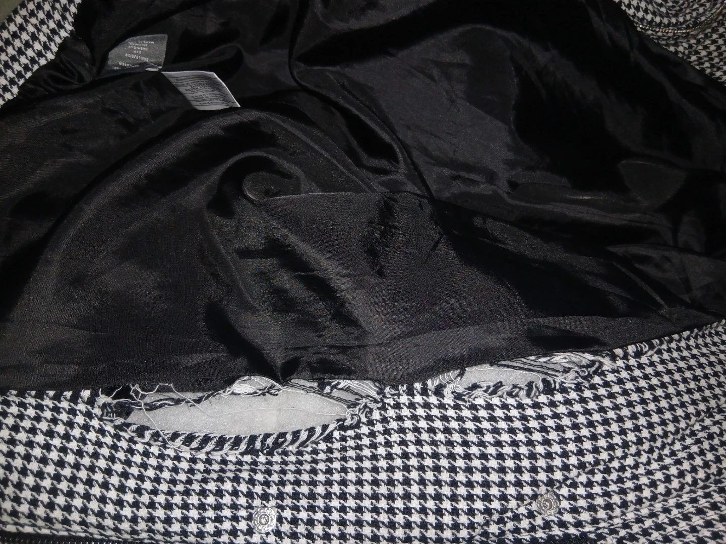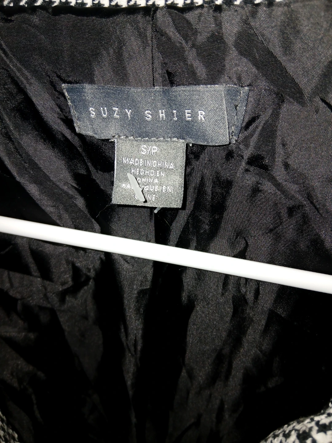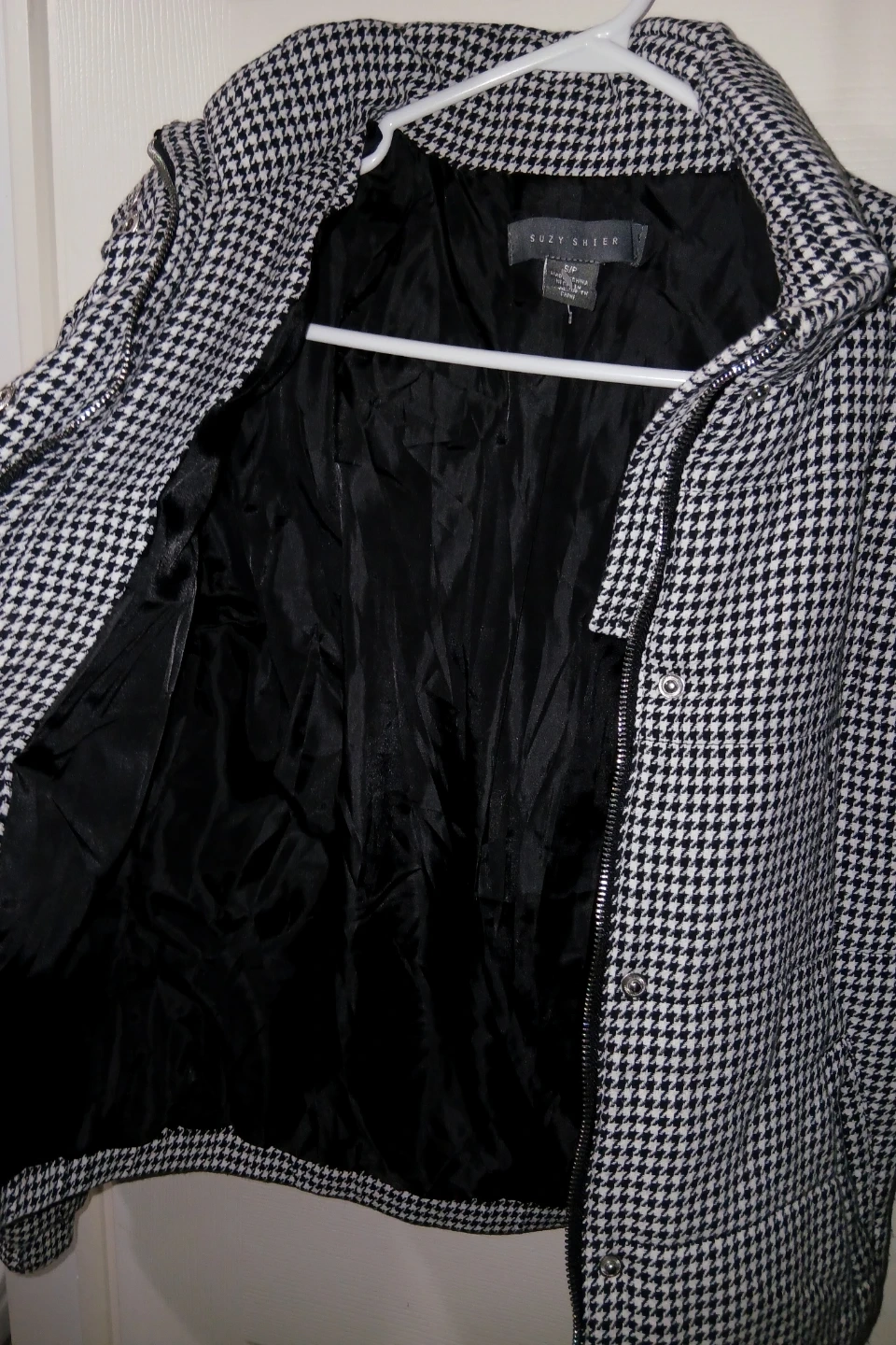 Houndstooth puffer jacket by Suzy Shier. It's in great condition, however you would have to sew the lining back together with the houndstooth fabric (all those rips happened in the washing machine).