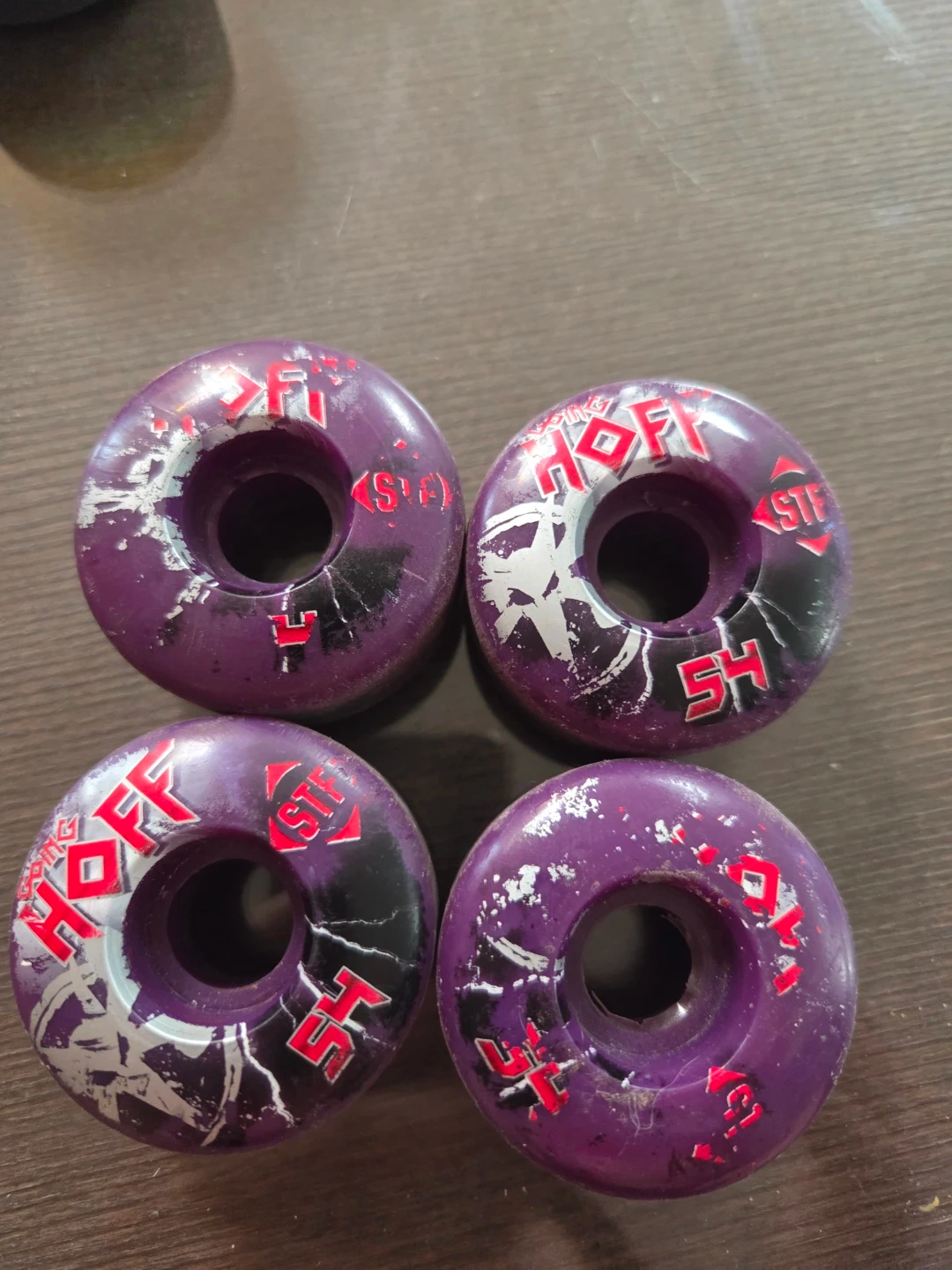 These are four purple skateboard wheels. They're 54mm in size. Perfect for street skating or replacing old wheels!