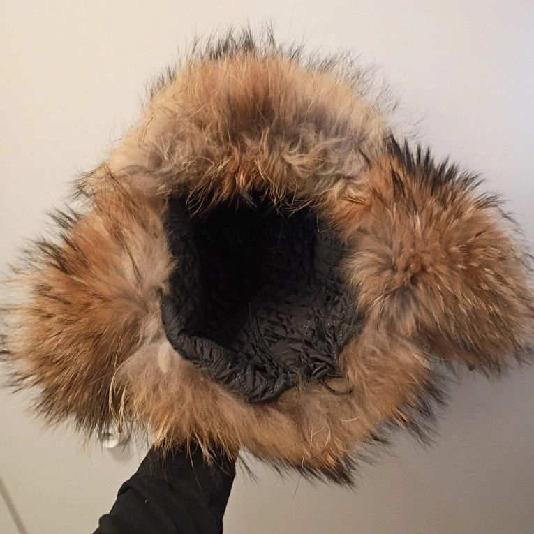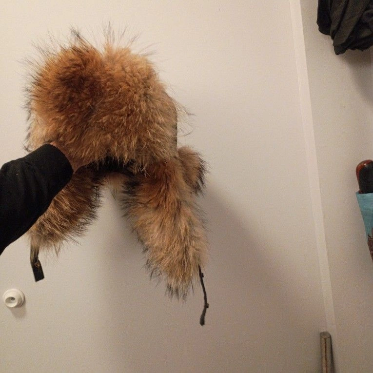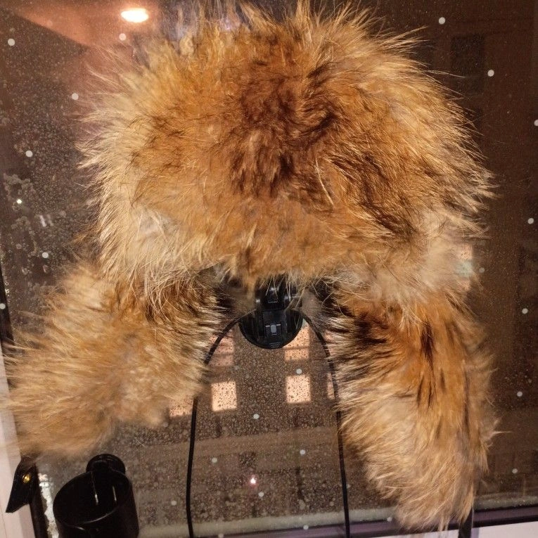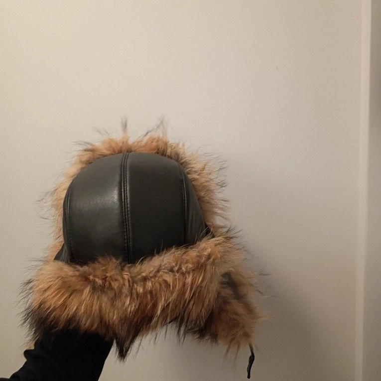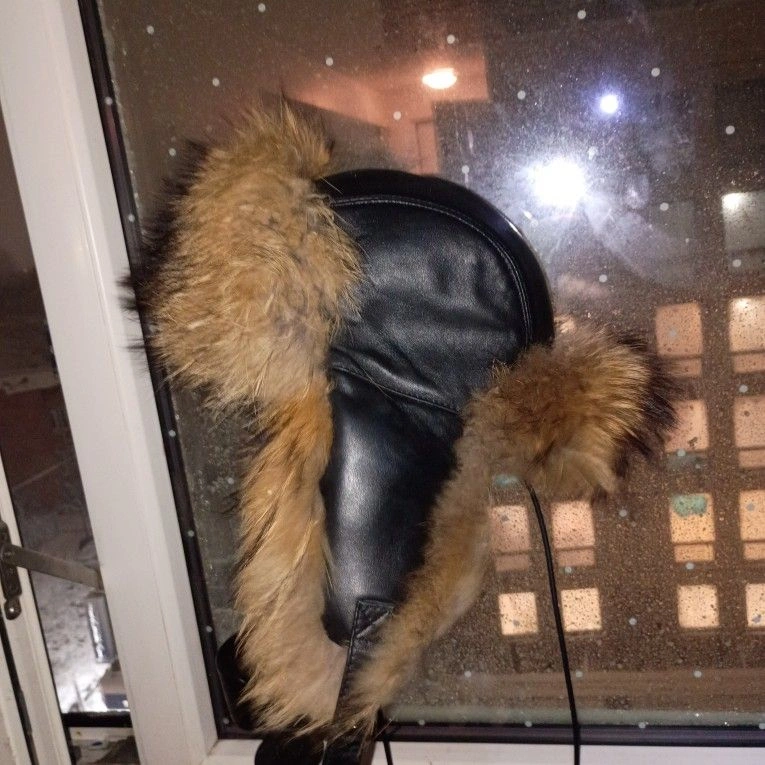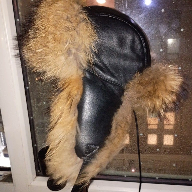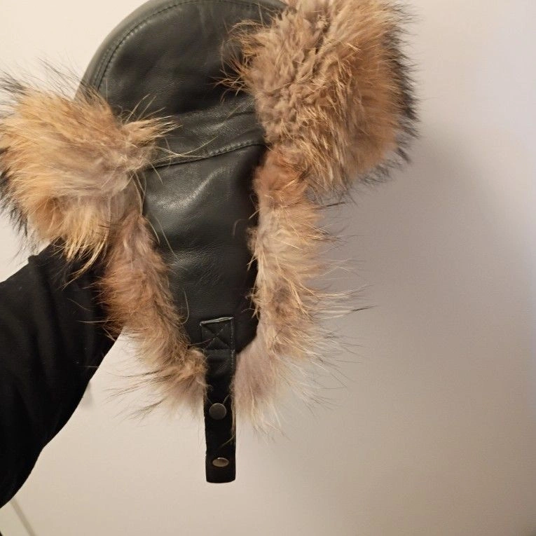 This is a Russian Ushanka Racoon fur extreme cold winter hat. It's a beautiful hat and even more beautiful in person but as amazing as it looks it equally works as amazing. Be prepared to be warm because you'll wish you could crawl completely into your hat instead of just wearing it. Dominant Color: Brown. Material: Leather.