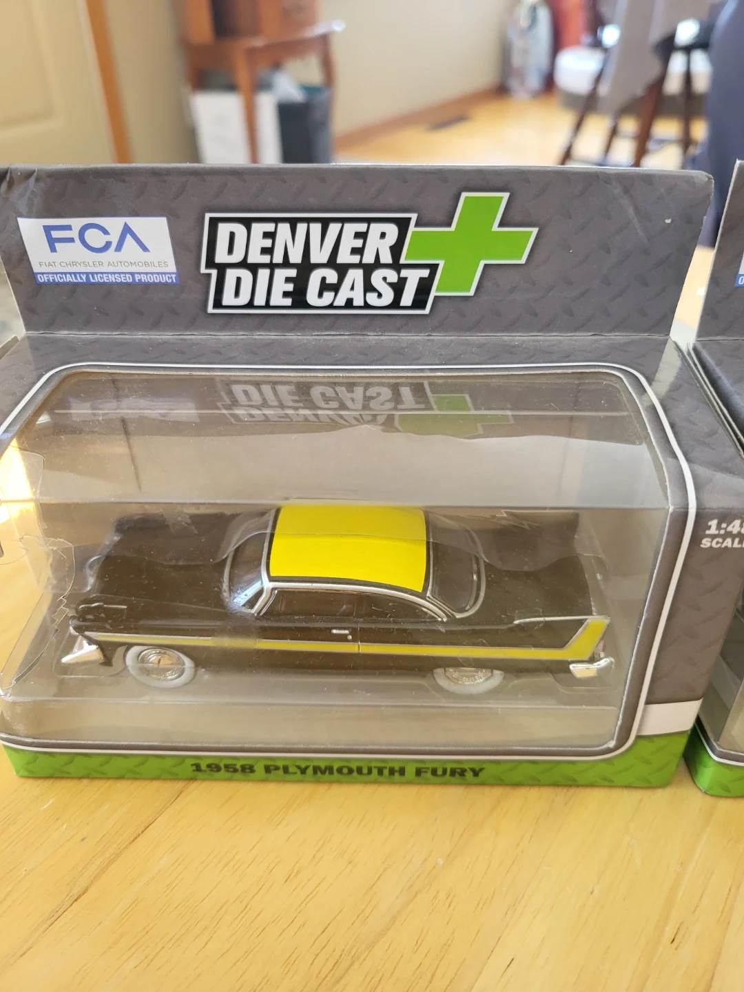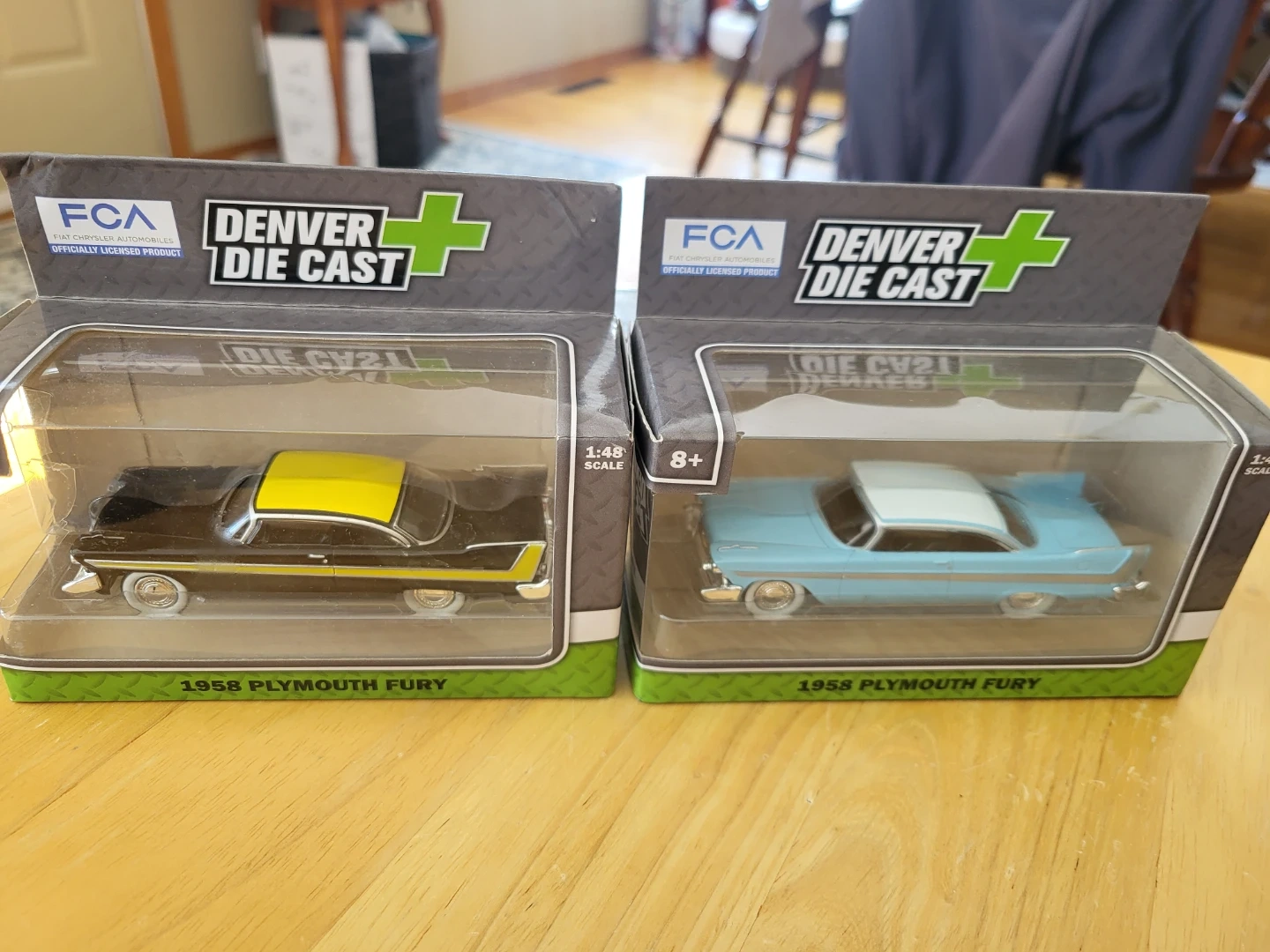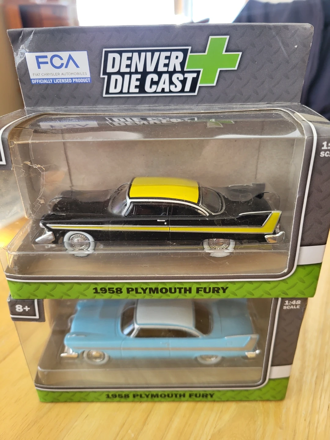 Two Denver Die Cast 1:48 scale model cars of the 1958 Plymouth Fury. One is black with yellow accents, and the other is light blue with a white roof. Both are new in their original packaging.
