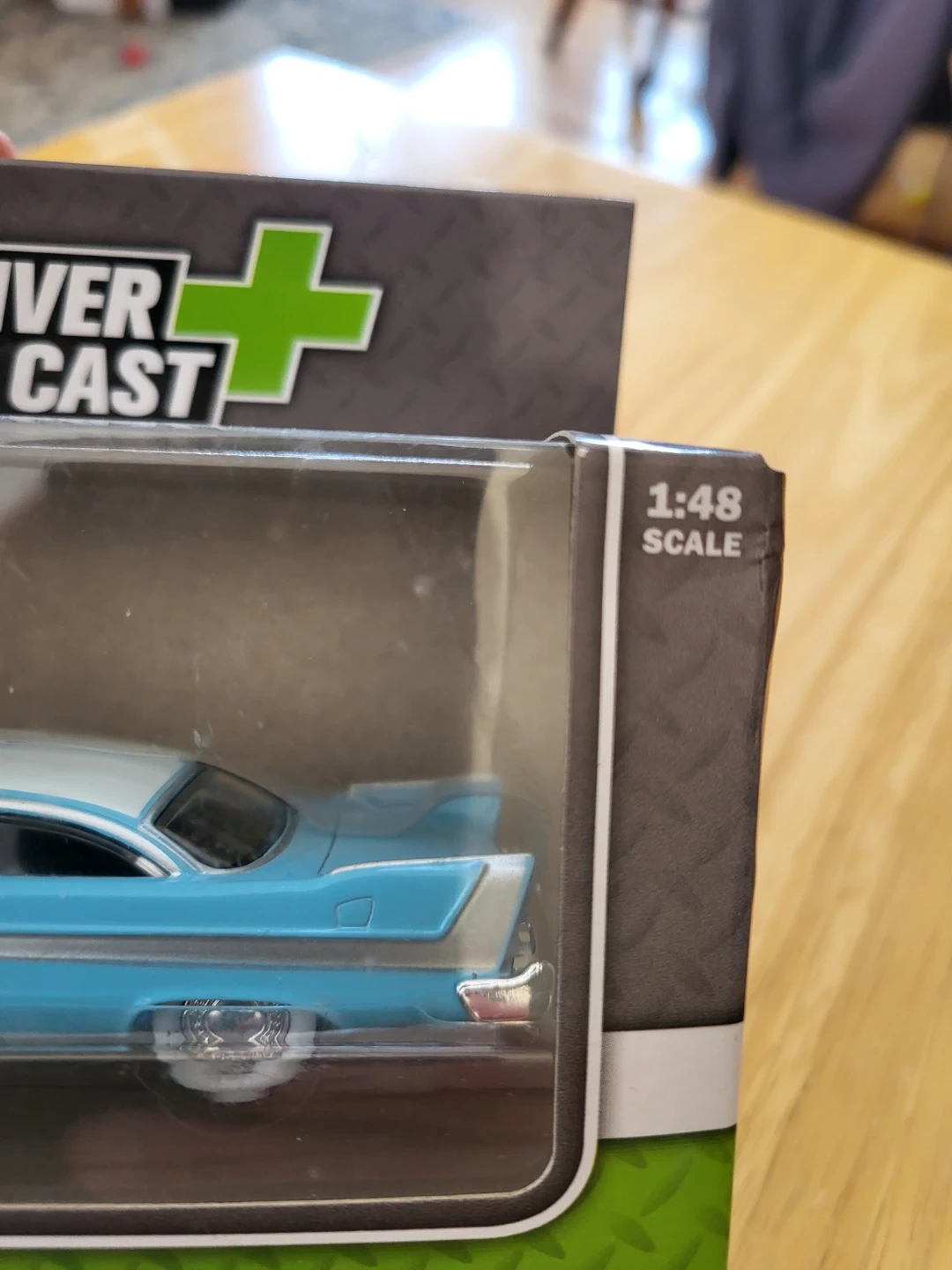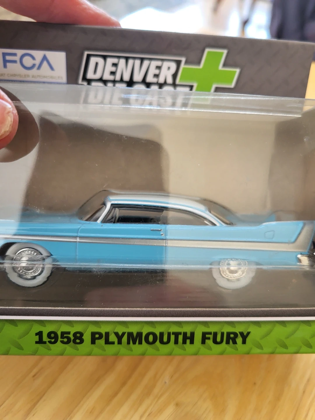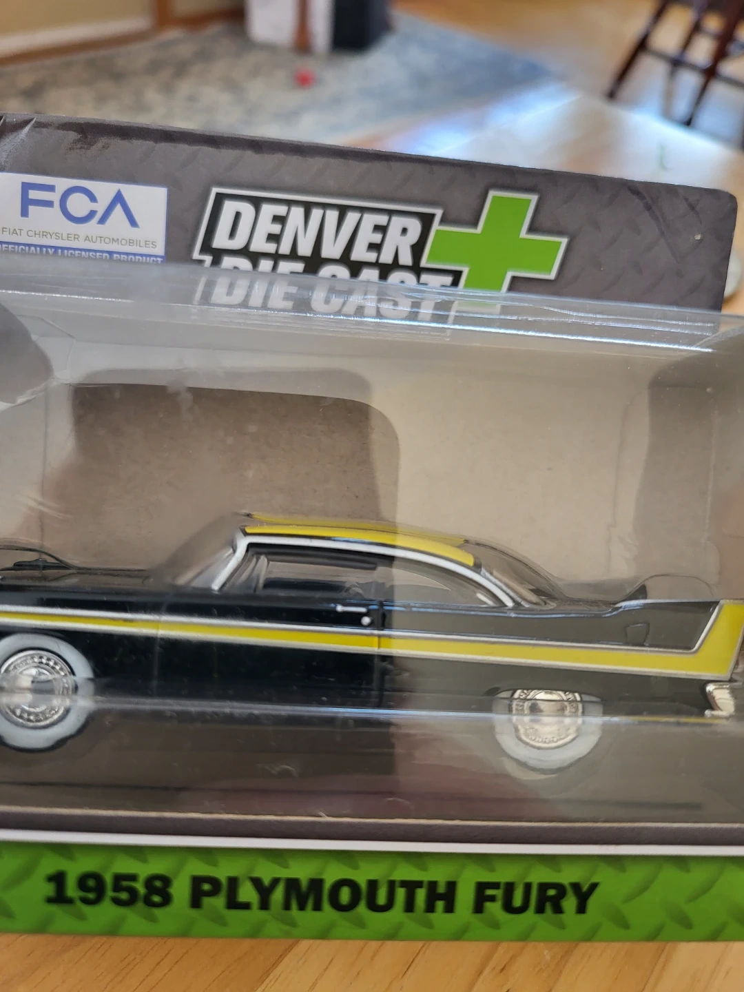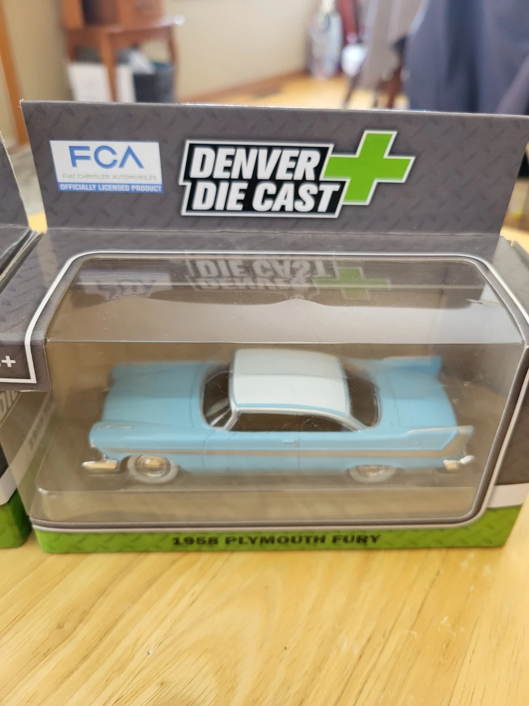 Two Denver Die Cast 1:48 scale model cars of the 1958 Plymouth Fury. One is black with yellow accents, and the other is light blue with a white roof. Both are new in their original packaging.
