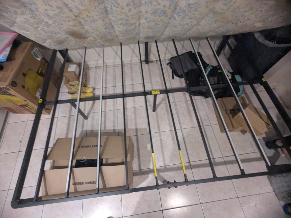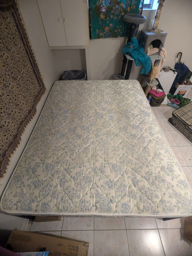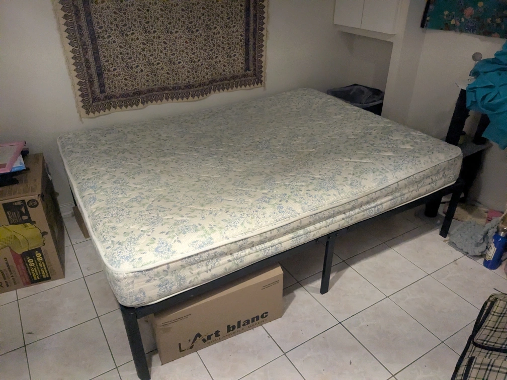 Queen-sized mattress, has some stains. Frame is in very good shape and can be disassembled. Frame provides about 15" of space under the mattress. I have tools and instructions for frame reassembly. I am willing to part with the frame without the mattress if you are uncomfortable with the stains.