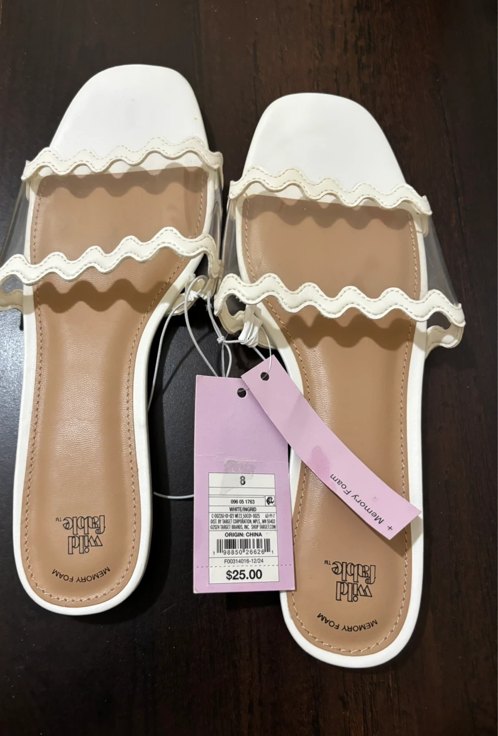 Women's slide sandals in white with clear straps and a scalloped trim. They have memory foam insoles for comfort. Size is 8.
