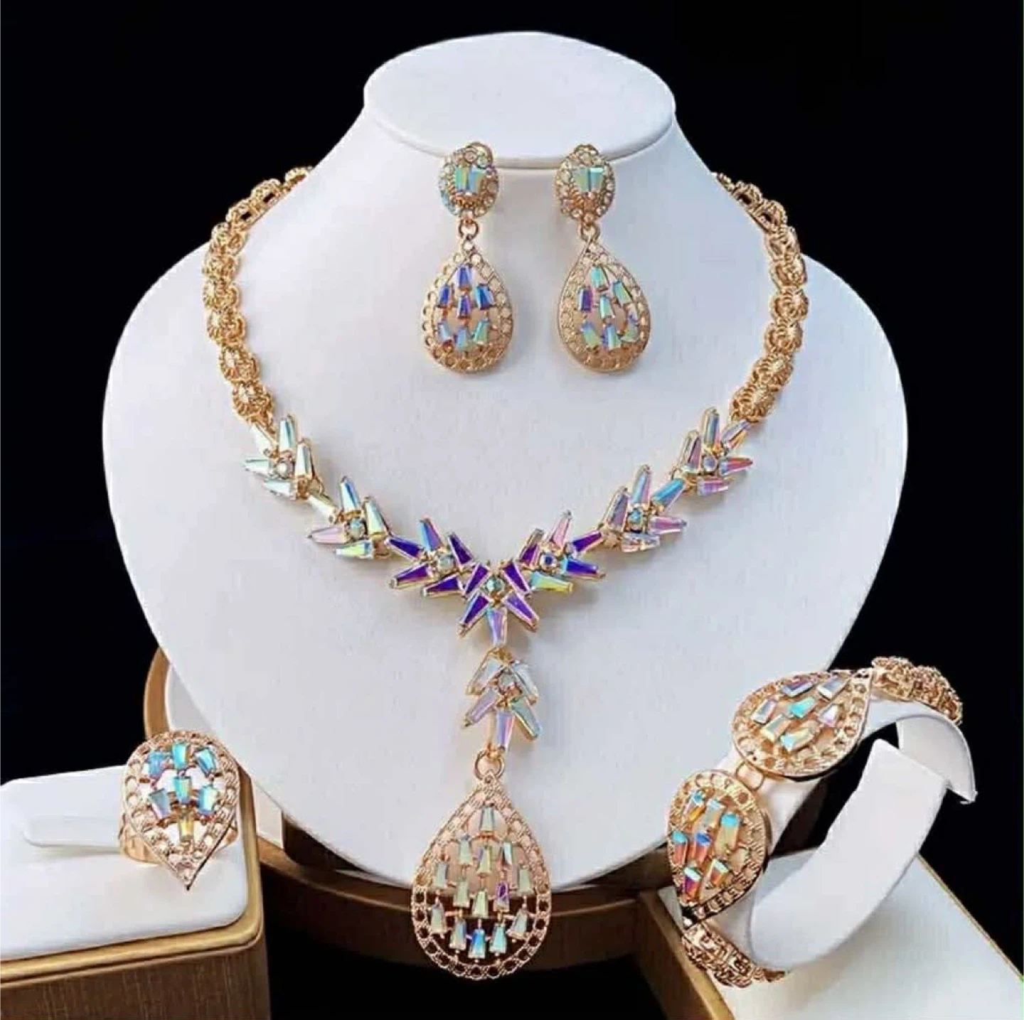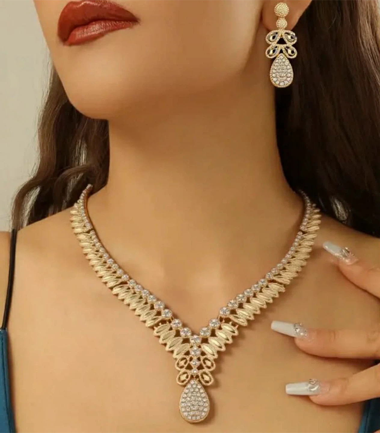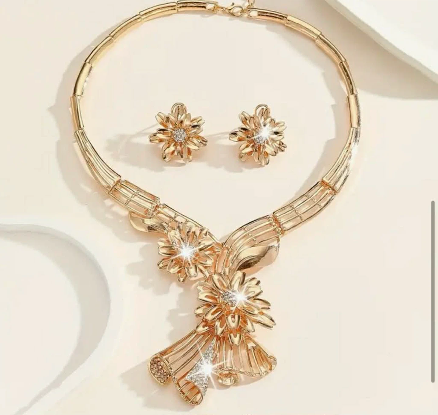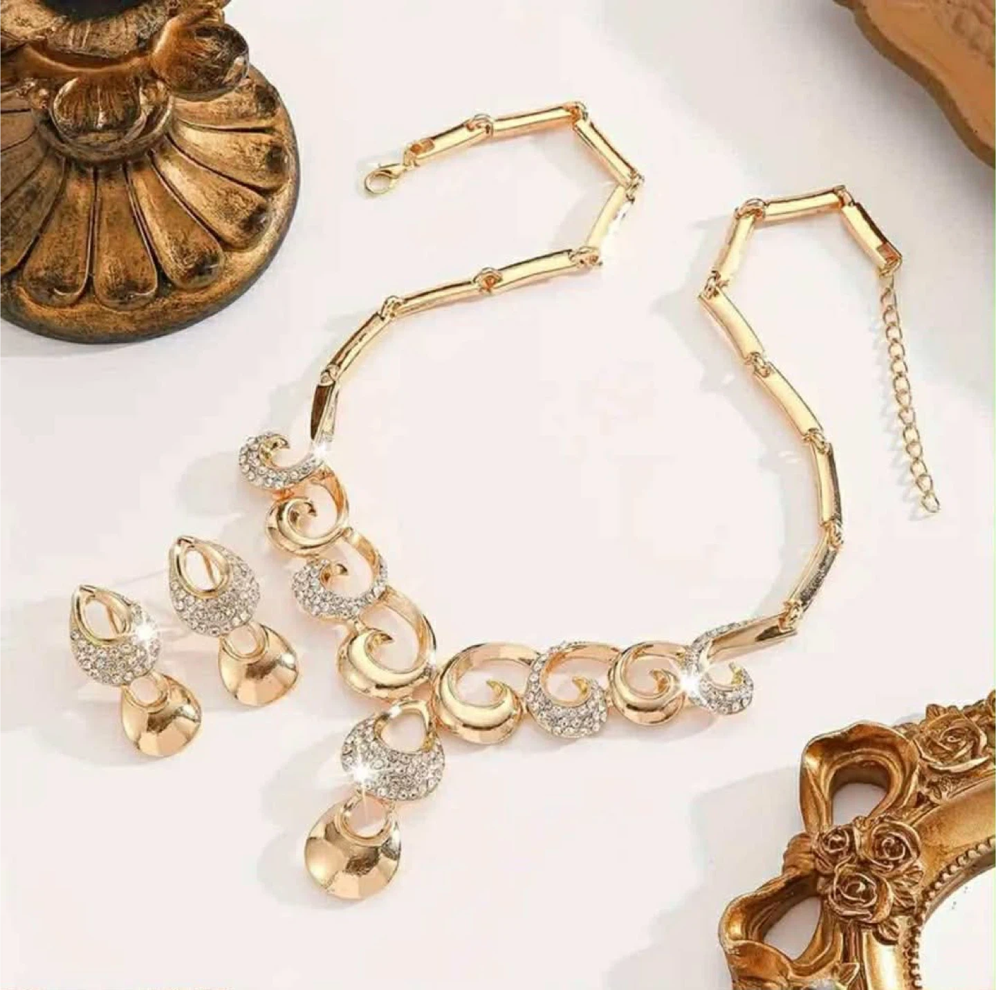 This elegant jewellery sets includes a statement necklace and matching earrings. It's made with a gold-tone finish and sparkling accents. Perfect for adding a touch of glamour to any outfit!