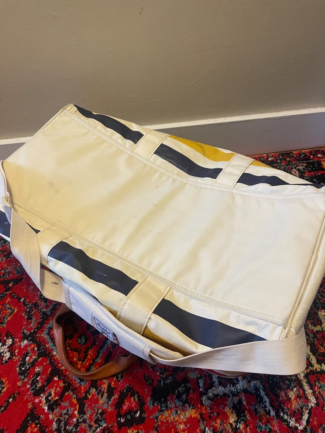 Selling this used HBC x Herschel Duffel Bag (retailed in 2016) that “combines the iconic HBC stripes with premium Herschel Supply finishes, including vegetable tanned leather and blue chambray liners.” See photos for general condition - aside from a few scruffs to outer fabric that could be cleaned up, the duffel is in great condition with no tears, rips, or stains. Internal lining is in perfect condition and all zippers are intact. Let me know if you have any questions about the item.