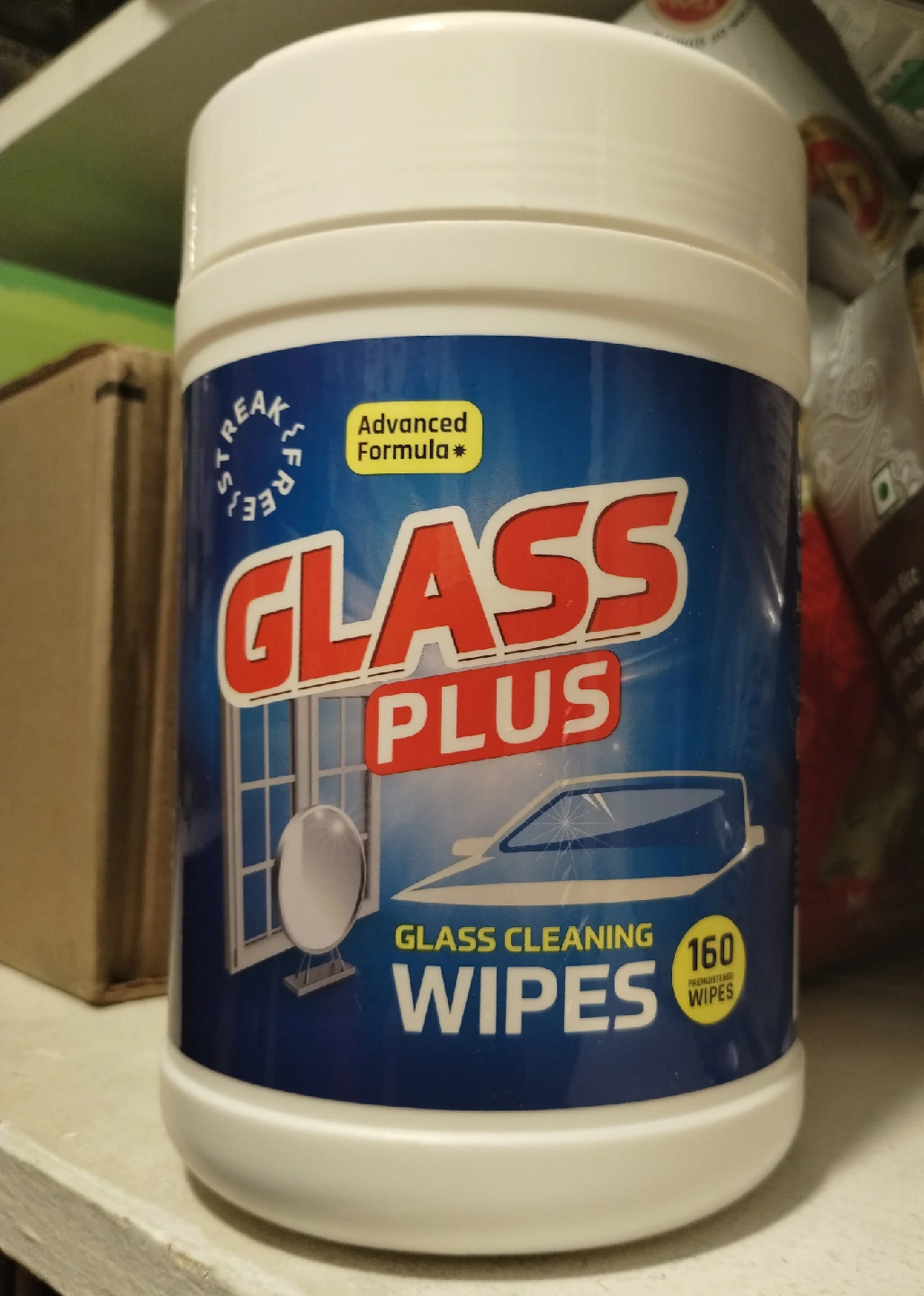 Selling a container of Glass Plus Glass Cleaning Wipes. It's an advanced formula that leaves surfaces streak-free. The container includes 160 premoistened wipes for cleaning glass surfaces like windows and car windshields