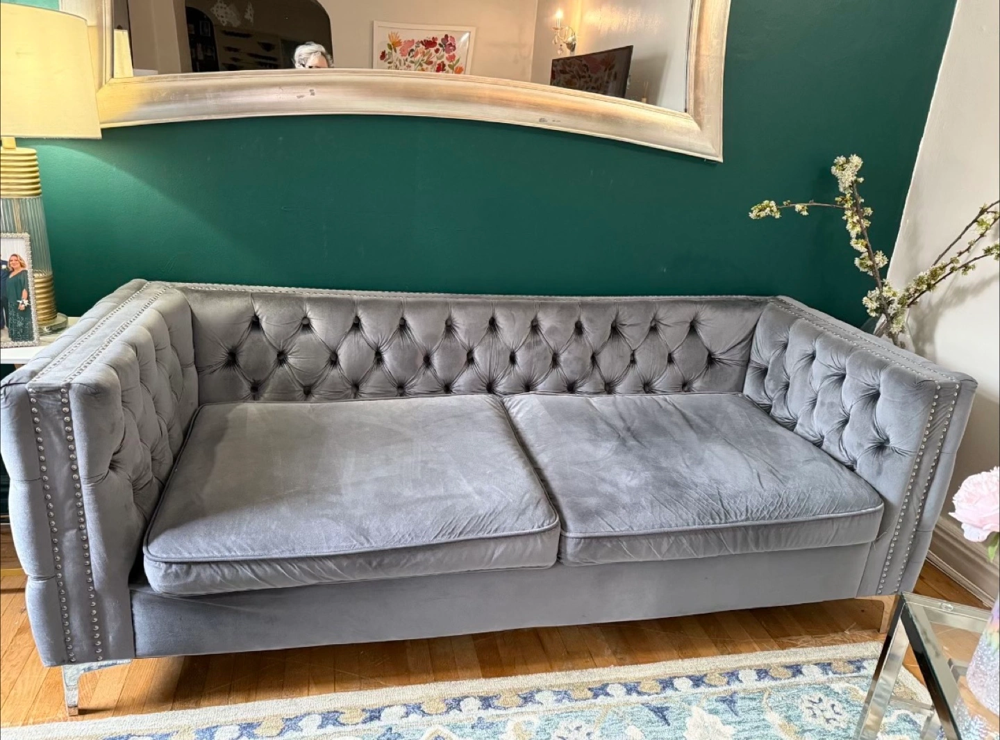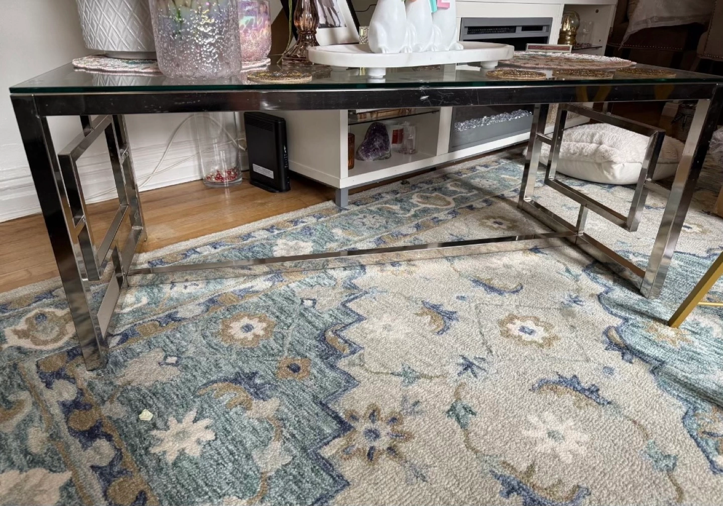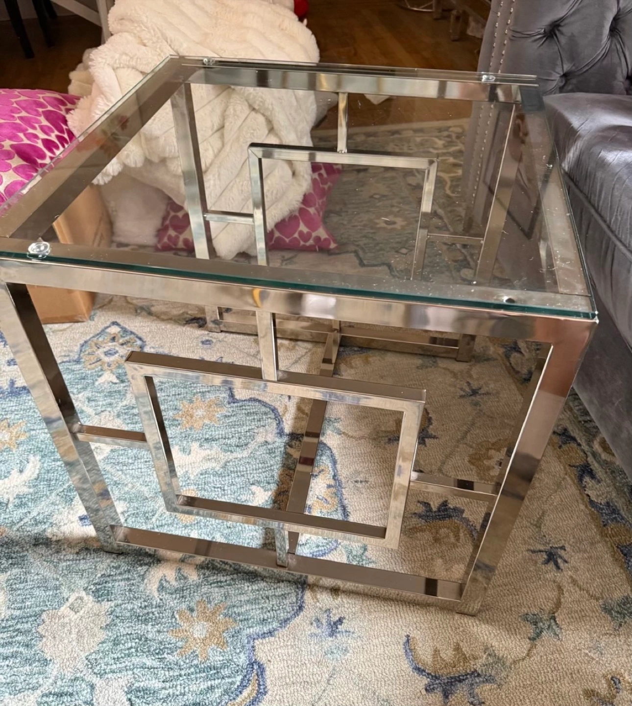 A chrome metal frame supporting a glass tabletop. Featuring a geometric design. The chrome finish adds a modern touch, elevating your space. Imagine using it as a coffee table to create a relaxing atmosphere.