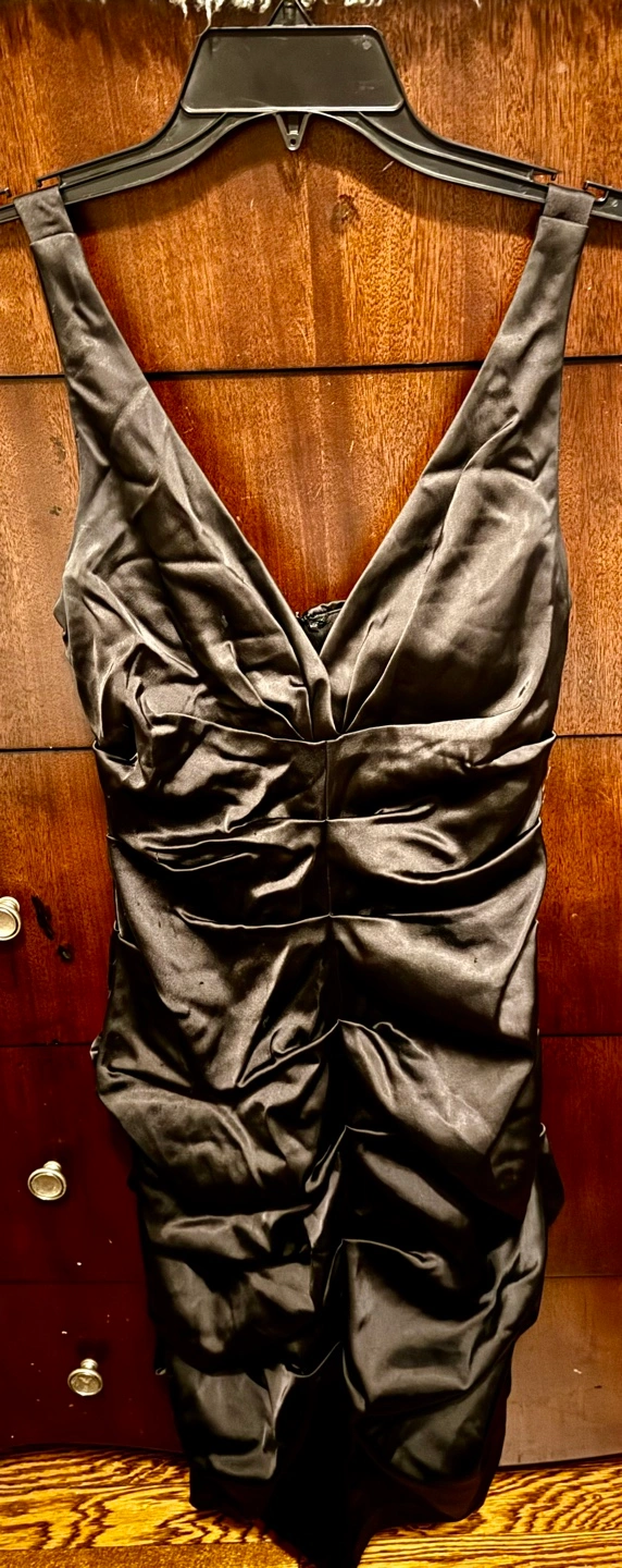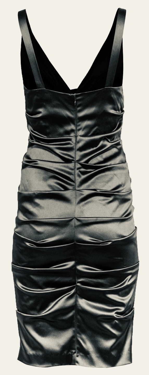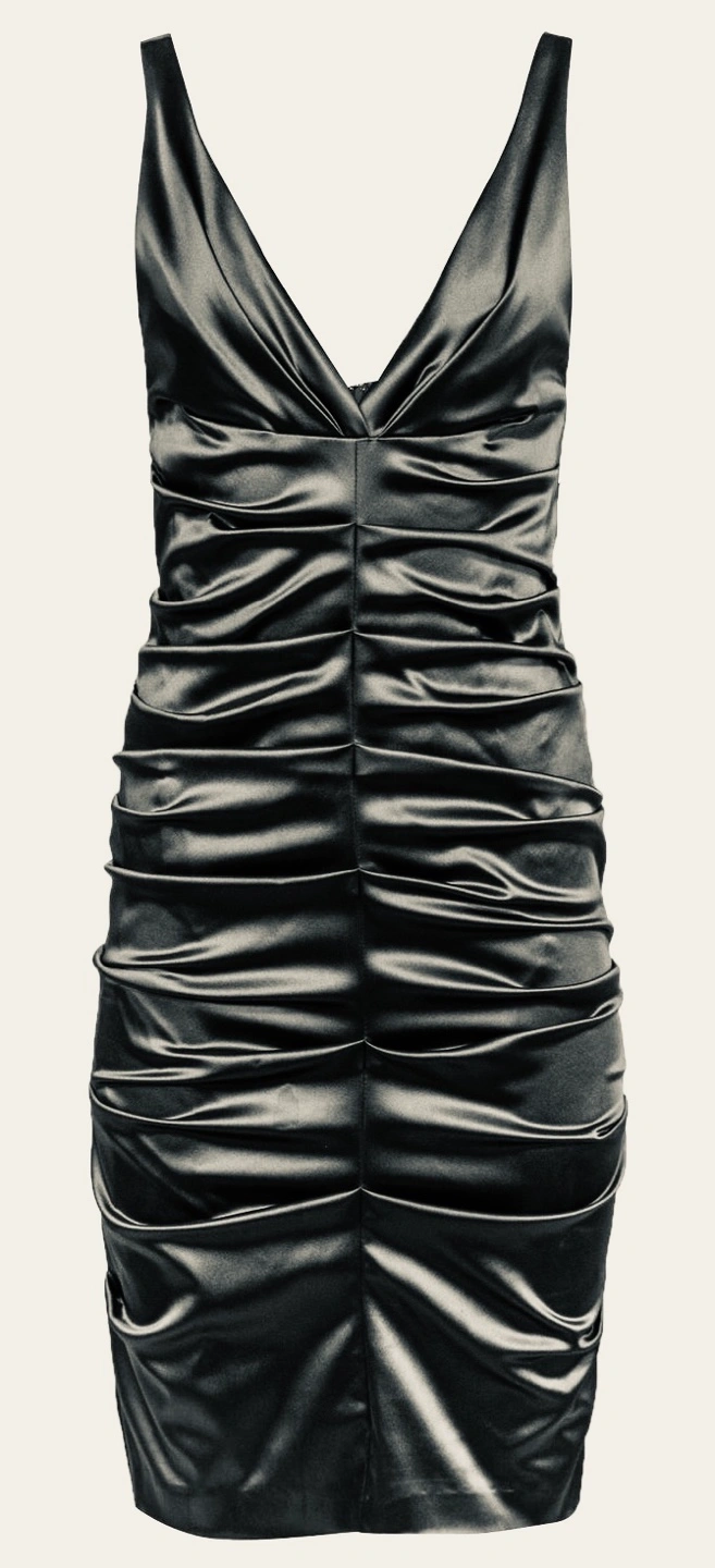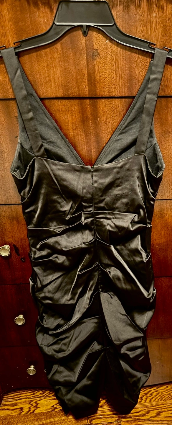 Very sexy Black satin dress with a deep V-neckline and ruched bodice. The dress has a back zipper and a form-fitting silhouette. It is sleeveless and knee-length.