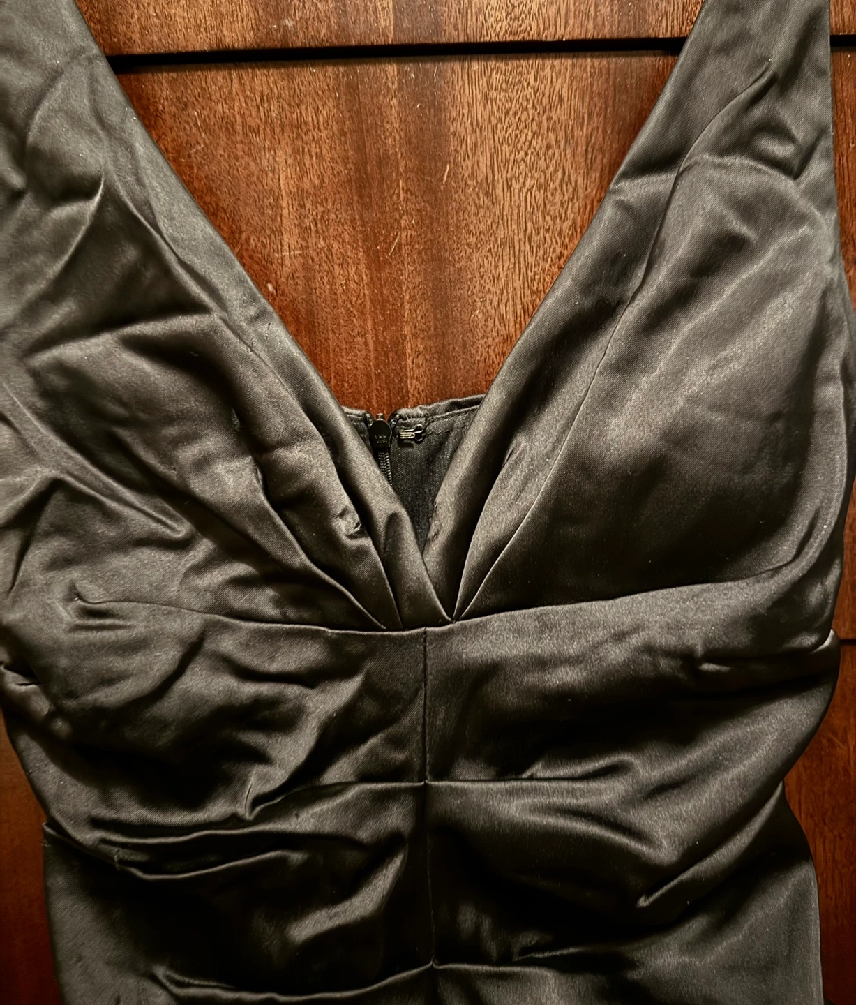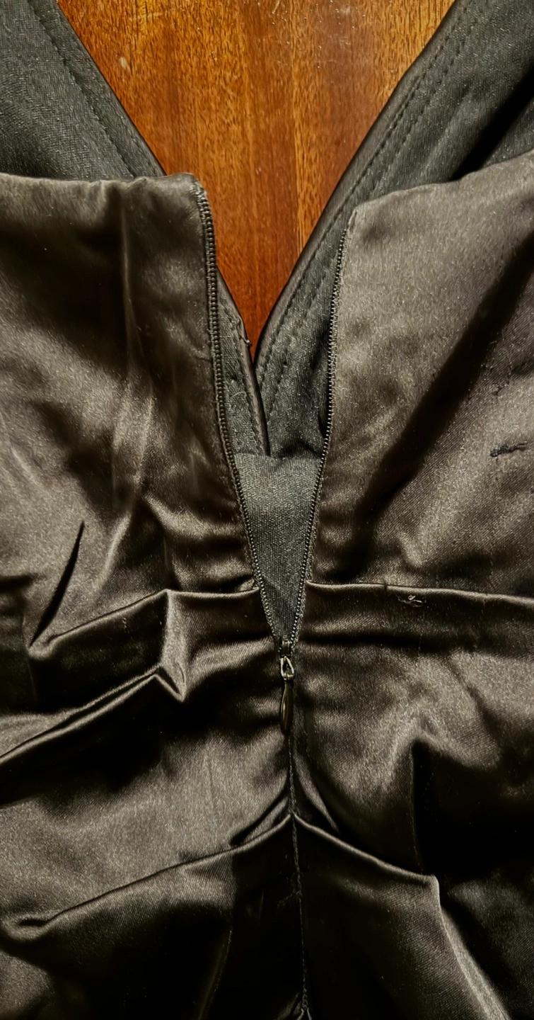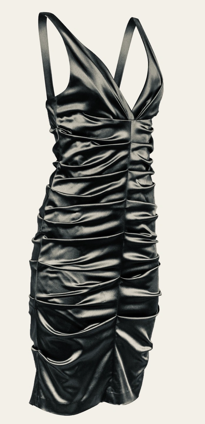 Very sexy Black satin dress with a deep V-neckline and ruched bodice. The dress has a back zipper and a form-fitting silhouette. It is sleeveless and knee-length.