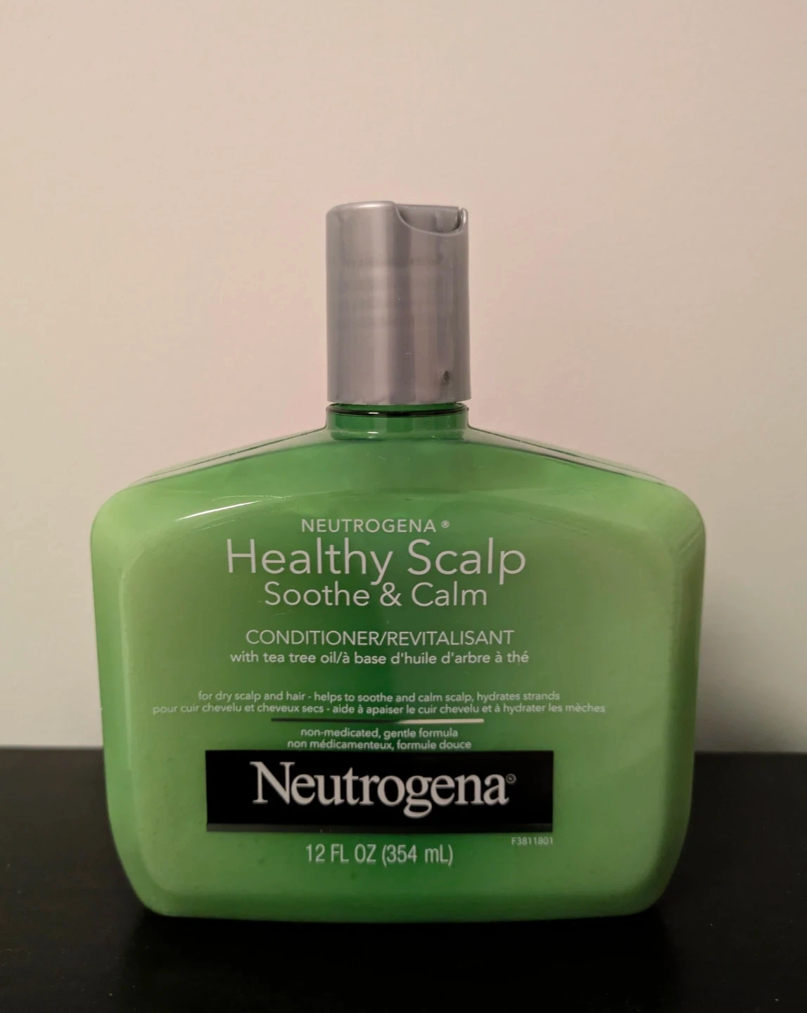 Selling a bottle of Neutrogena Healthy Scalp Soothe & Calm Conditioner. It's a revitalizing conditioner with tea tree oil, perfect for dry scalp and hair. It helps to soothe and calm your scalp while hydrating your strands. Gentle formula, non-medicated, and comes in a 12 fl oz (354 mL) bottle.