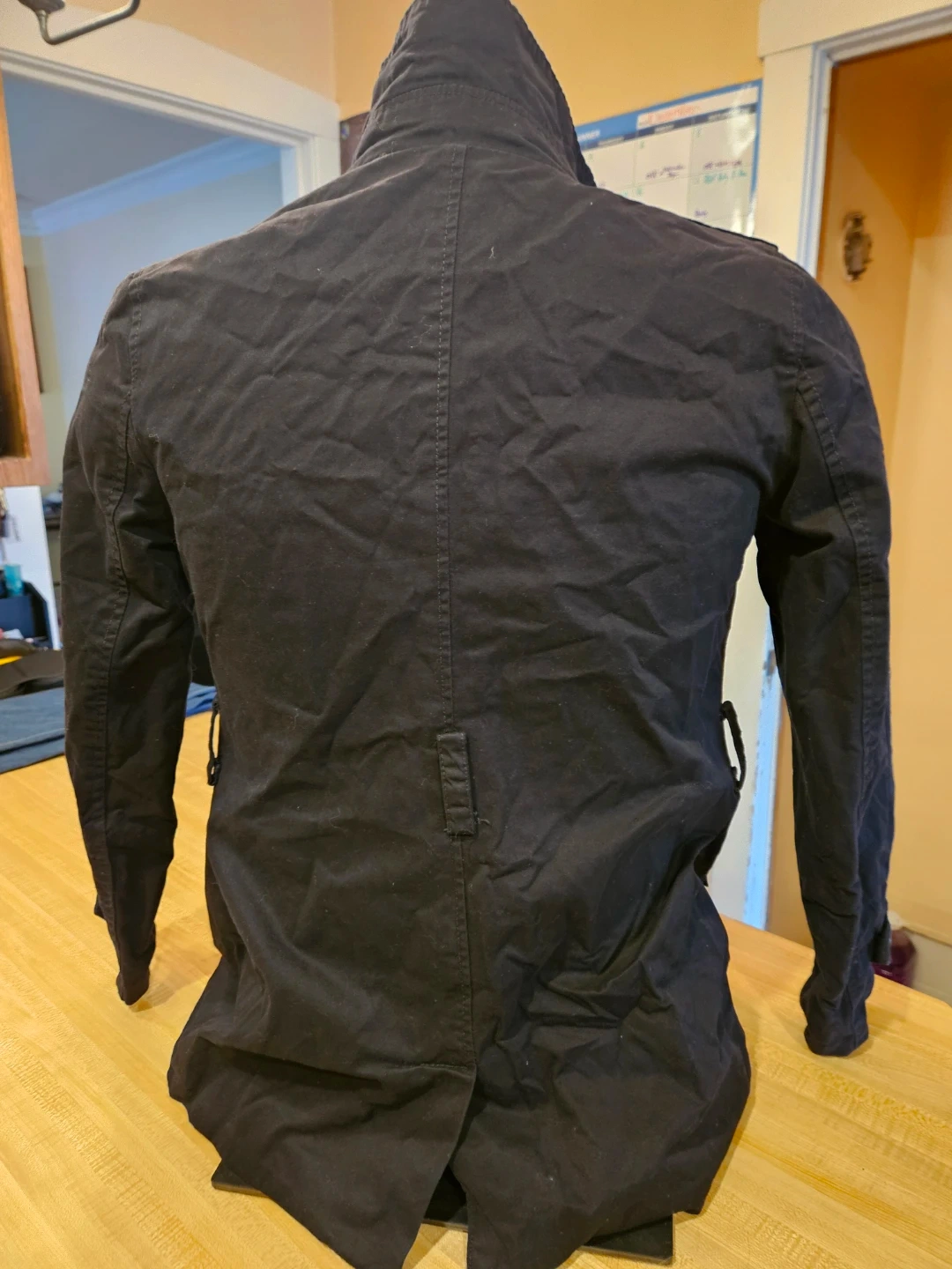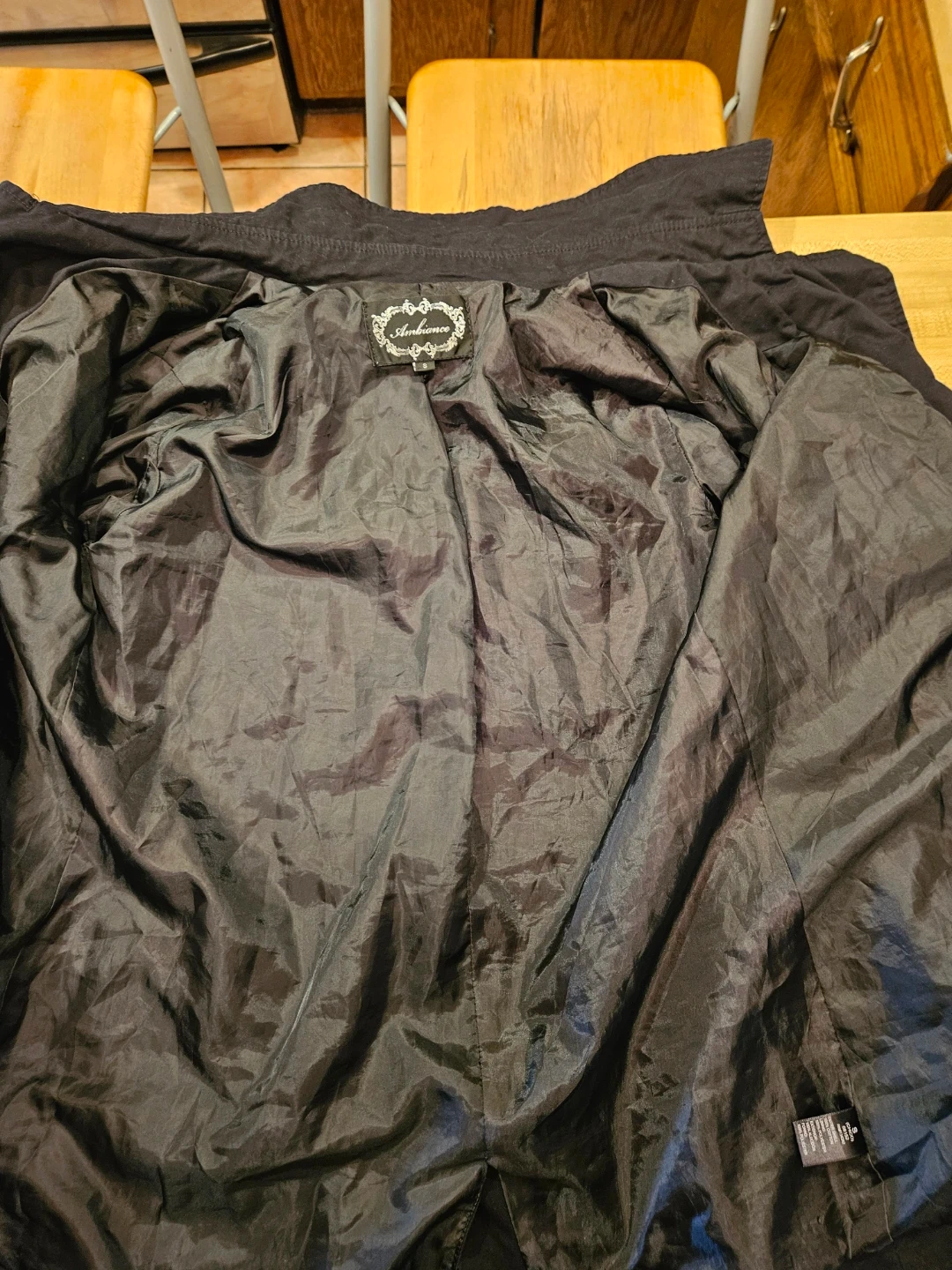 Here's a stylish black trench coat from Ambiance! It's a size small and features a double-breasted button closure. The outer shell is 100% cotton, while the lining is 100% polyester. Great for layering!