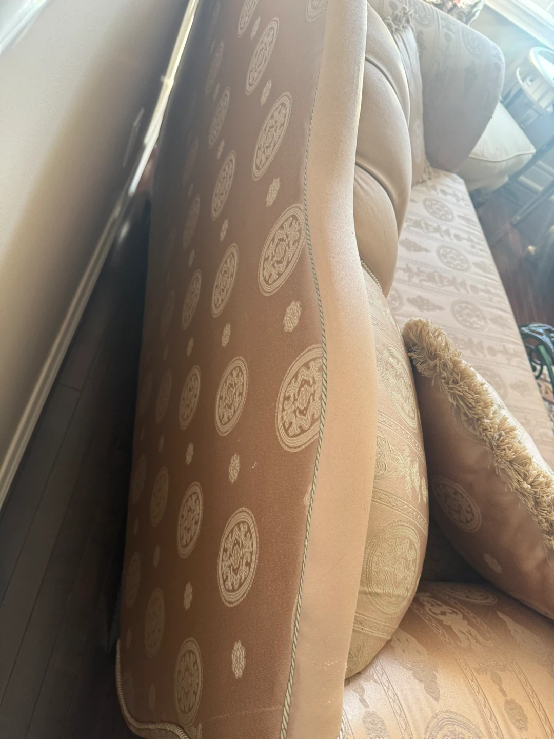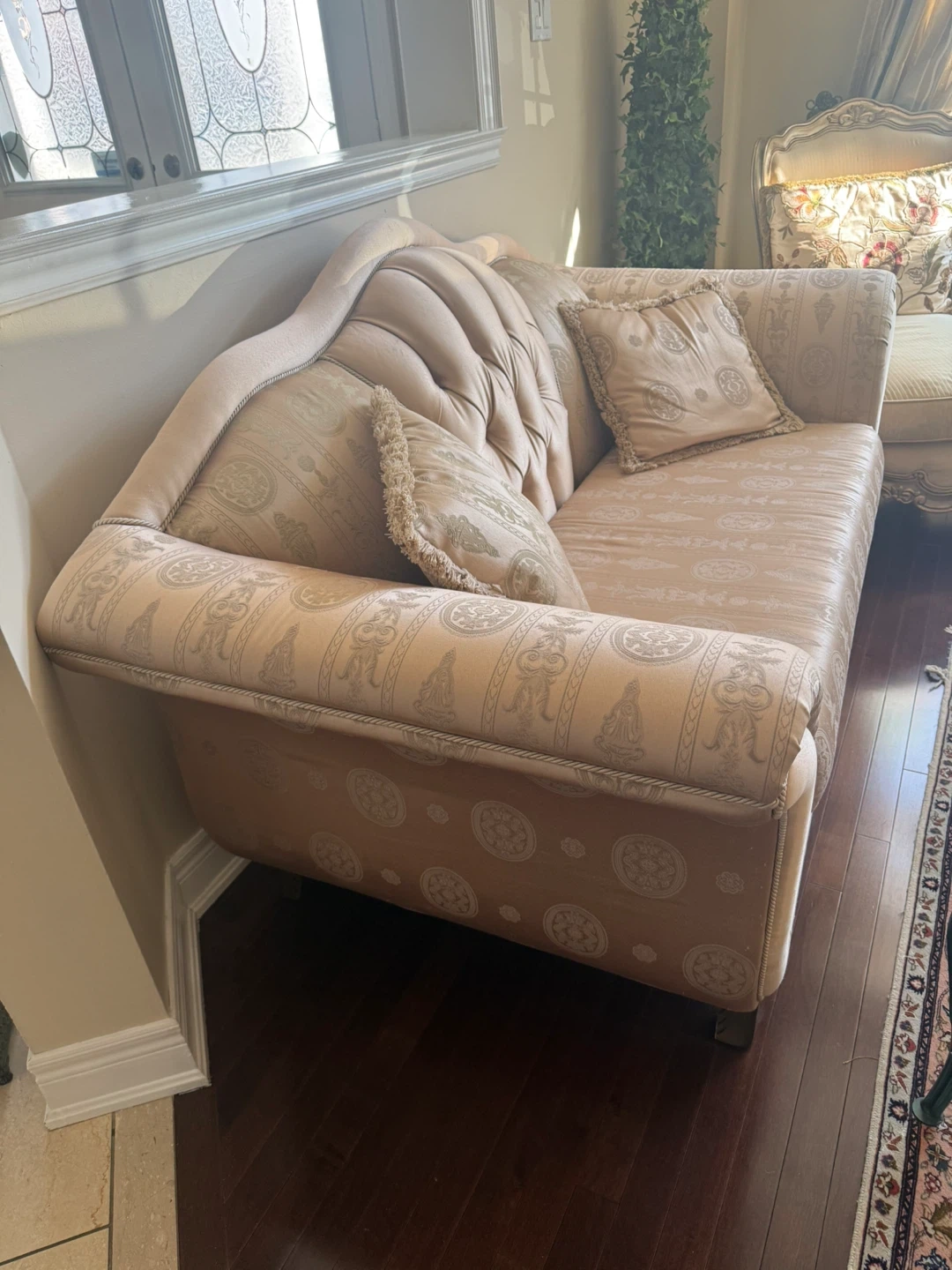 This is a lovely, ornate tufted loveseat with a decorative patterned fabric. It comes with two matching throw pillows, each with fringed edges. The upholstery features an intricate, classic design. It's a beautiful accent piece for any living room!
