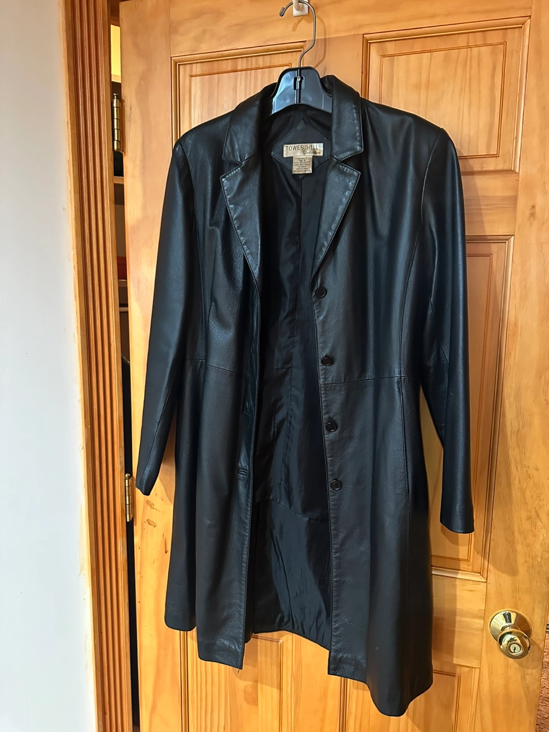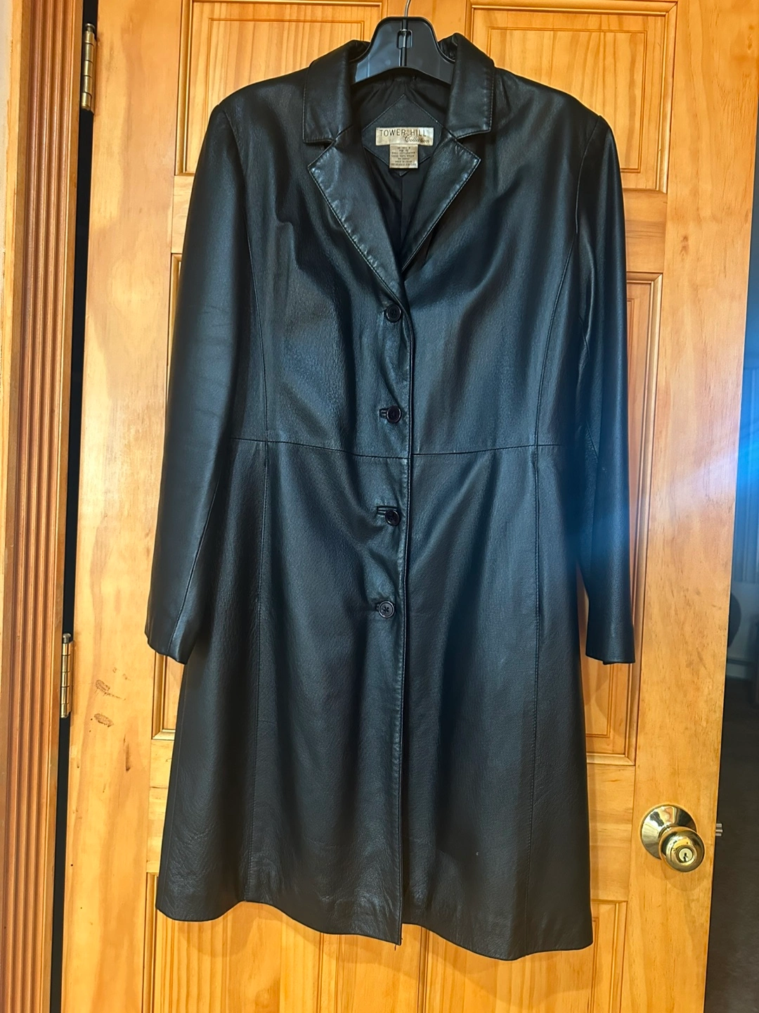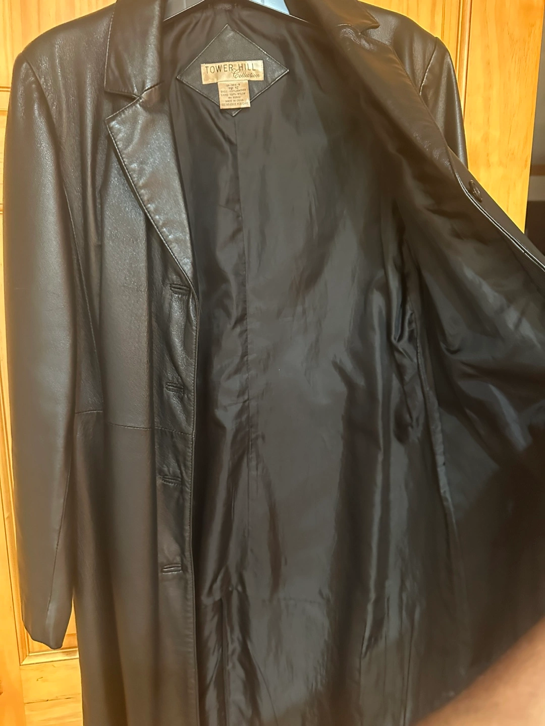Here's a stylish Tower Hill Collection black leather coat! It's perfect for adding a touch of sophistication to any outfit. The coat is in great condition and ready for a new home. It's made of genuine leather, so it's durable and will last for years to come