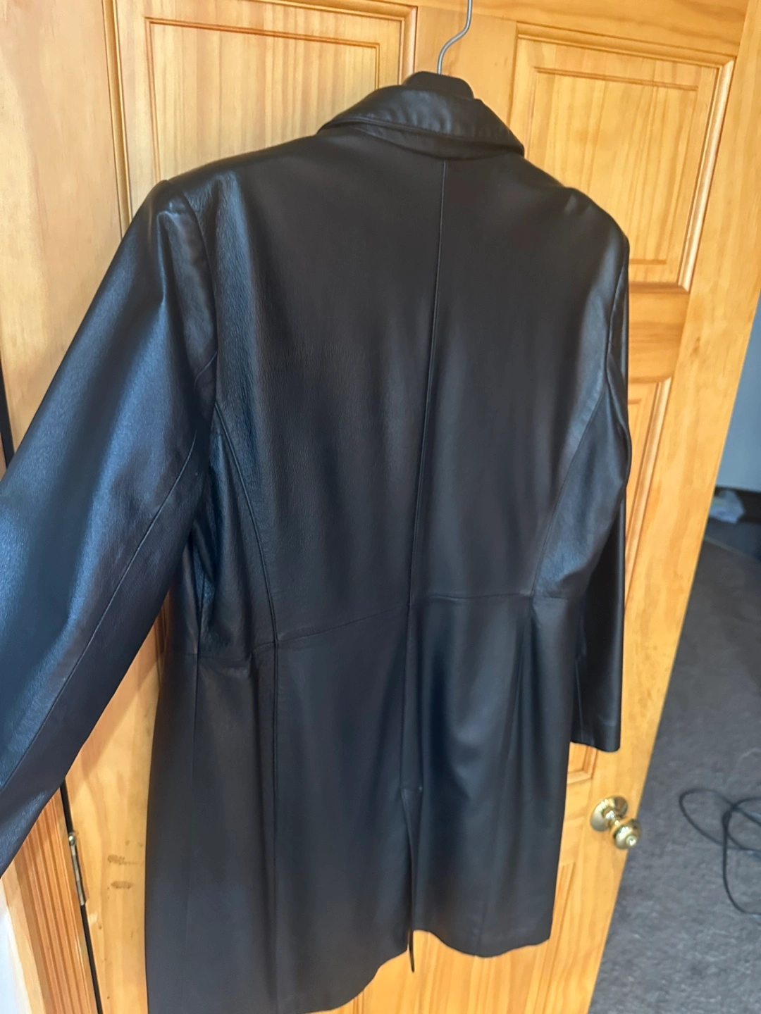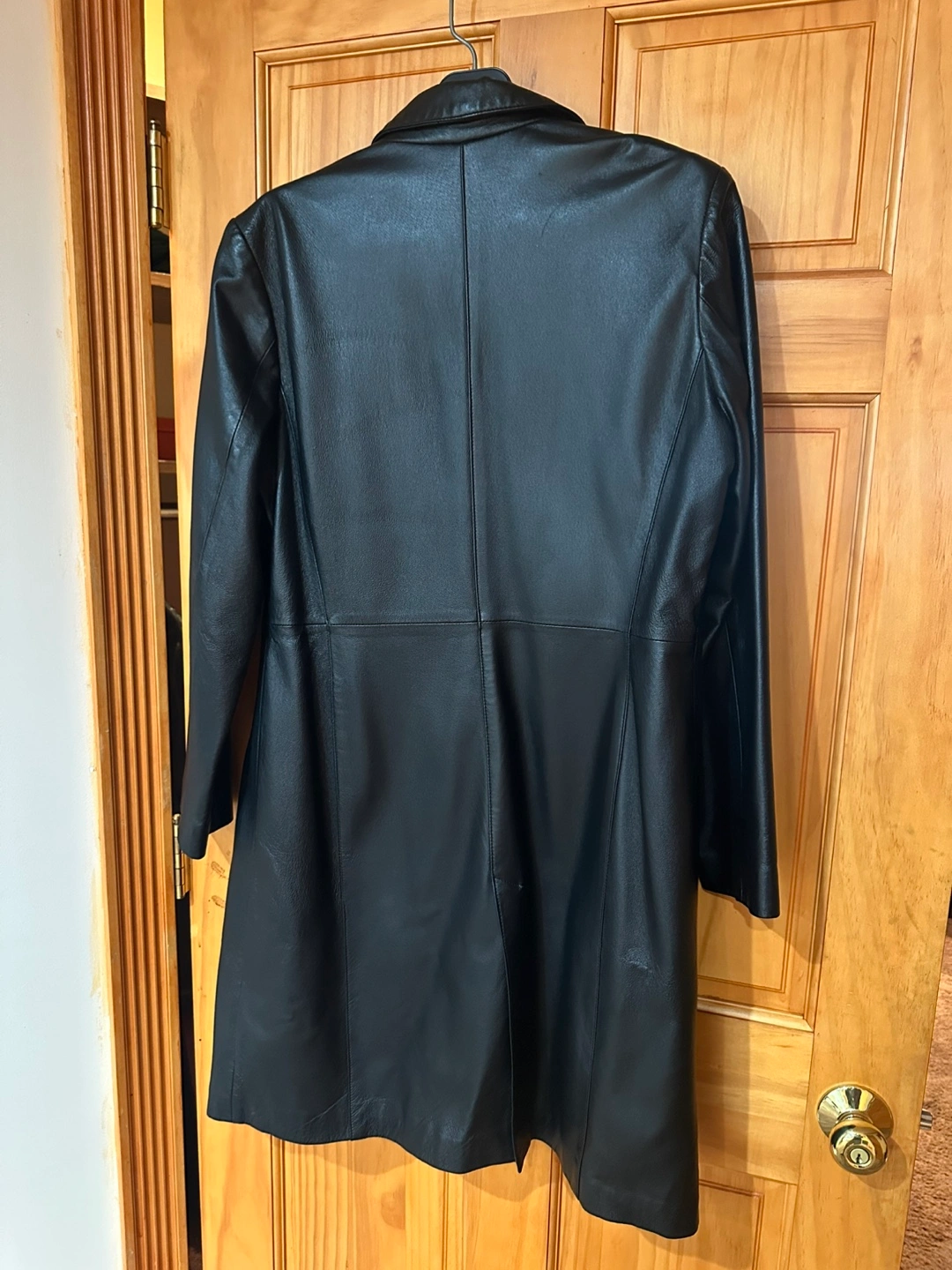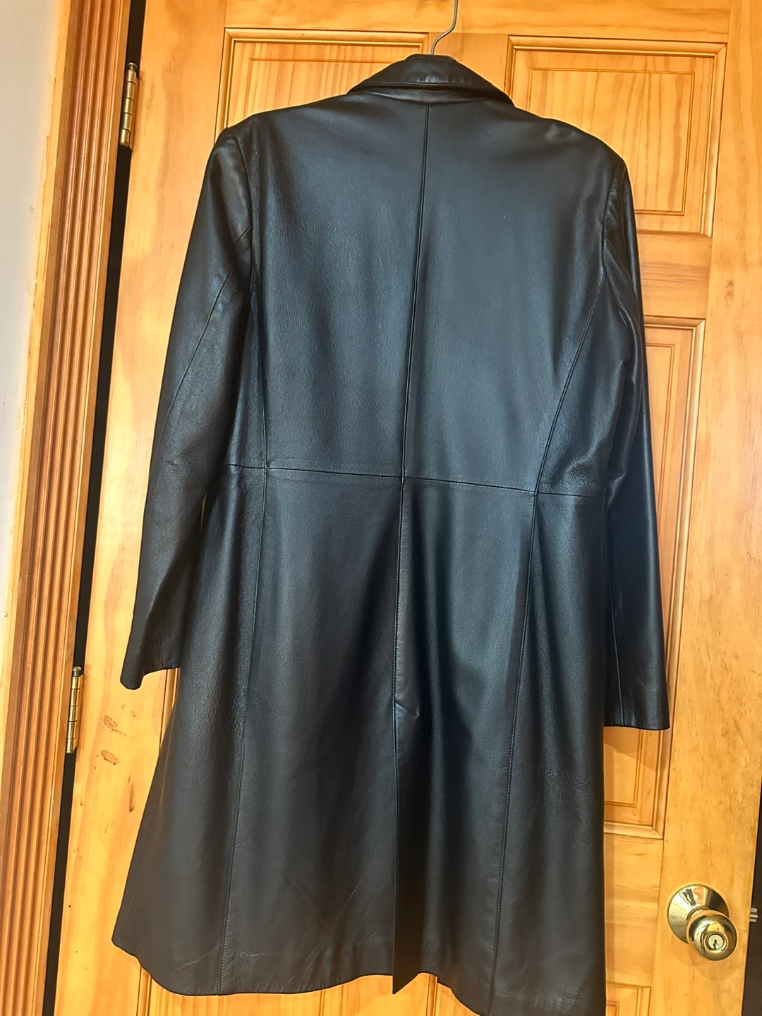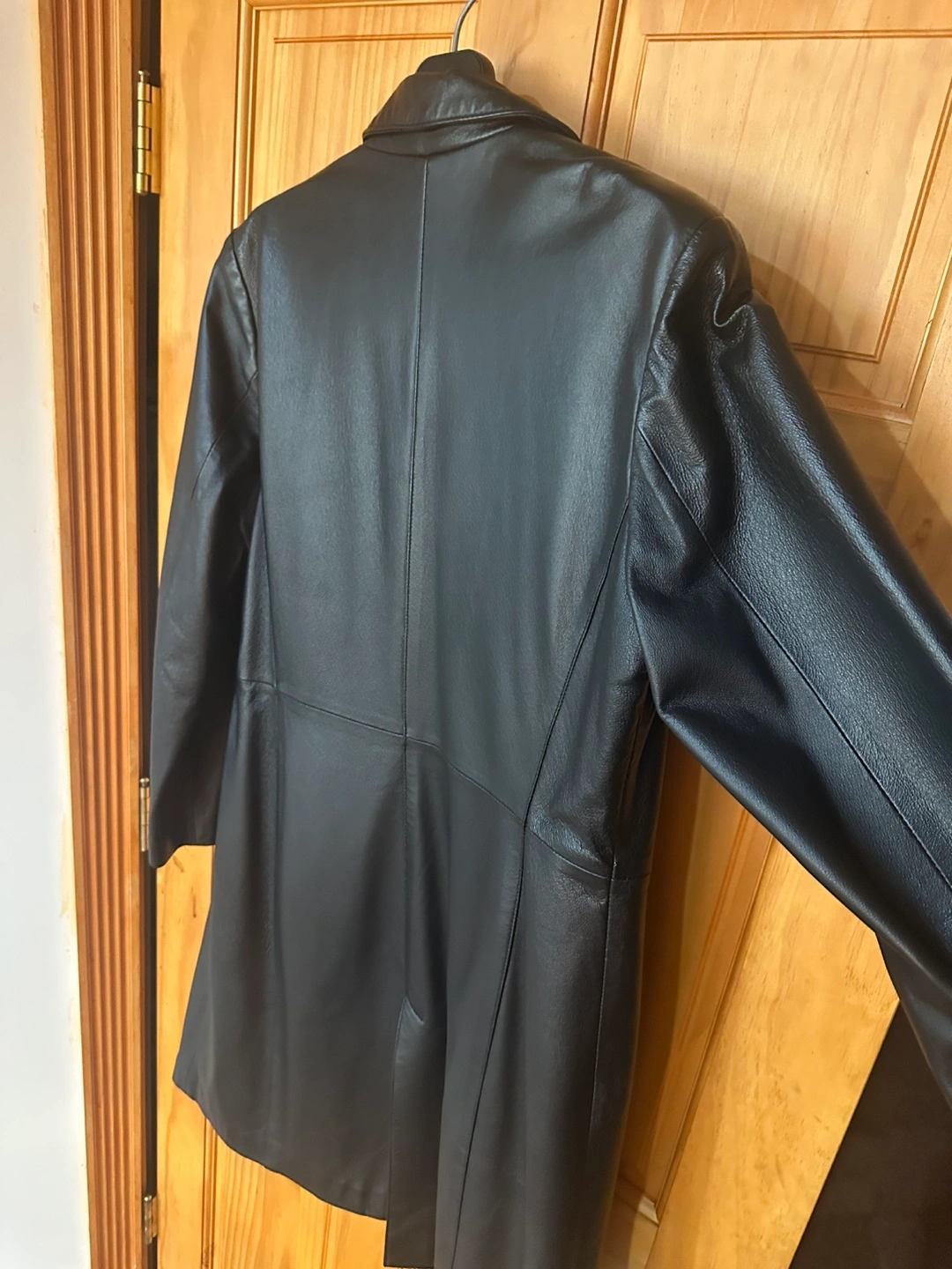 Here's a stylish Tower Hill Collection black leather coat! It's perfect for adding a touch of sophistication to any outfit. The coat is in great condition and ready for a new home. It's made of genuine leather, so it's durable and will last for years to come