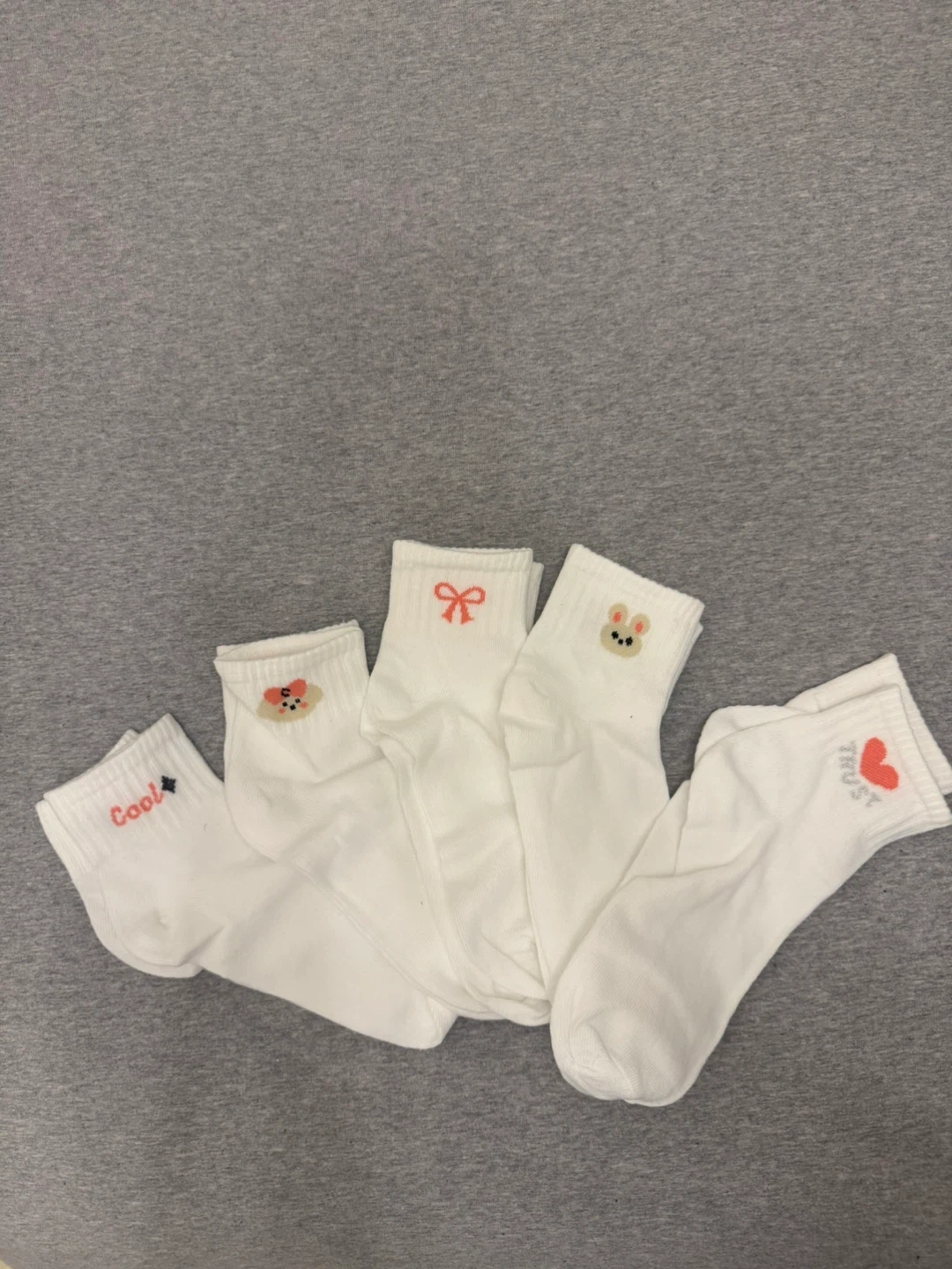 Here's a set of five pairs of adorable white socks! They feature cute little designs like a bow, a bunny, a bear, and a heart. Perfect for adding a touch of fun to your everyday outfits