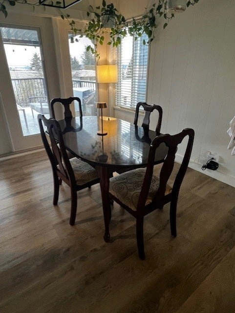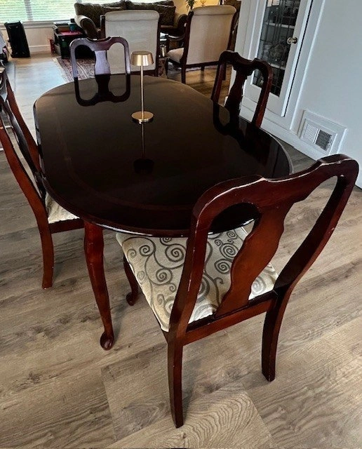 Mohegan Dining Table Set with 4 Wooden Chairs. Solid wood construction, fabric cushioned seating. Compact and elegant, perfect for apartment or family dining. Pickup from New Westminster. Let me know if you're interested!