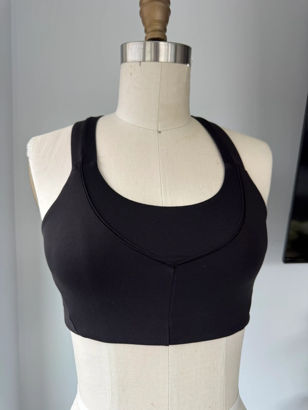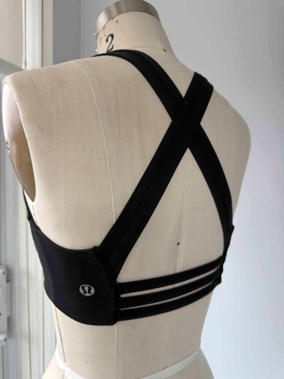 A Lululemon black sports bra with a criss-cross strap design on the back. It's made from a comfortable, stretchy material. This bra is great for medium-impact activities.