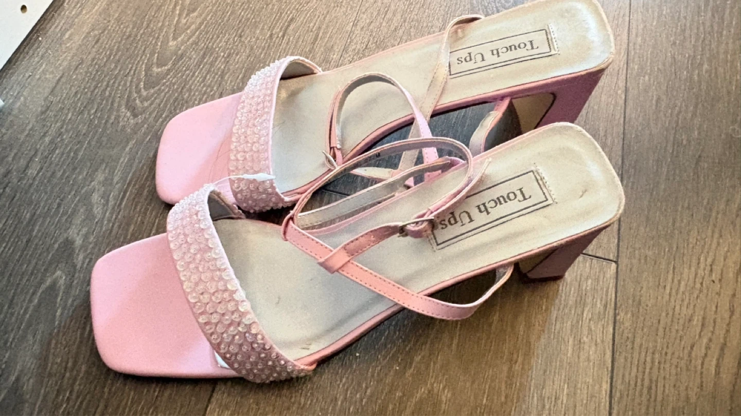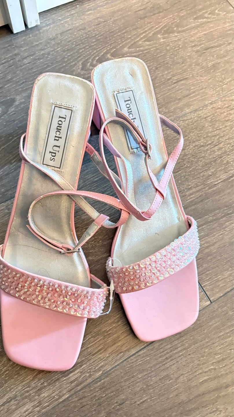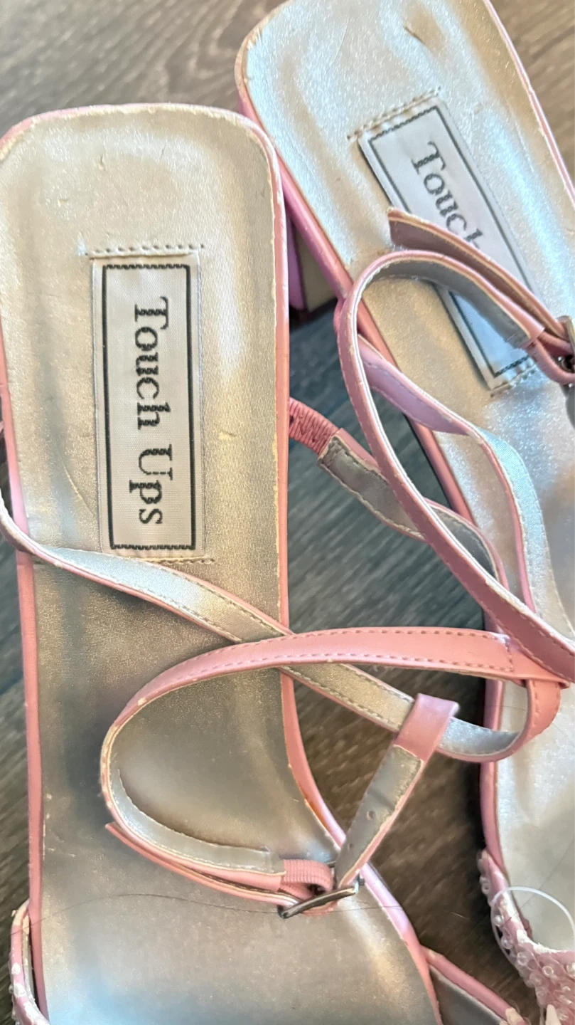 These Touch Ups heeled sandals are a lovely shade of pink with sparkly bead detailing across the strap. All man-made material, size 10. They're perfect for a special occasion or adding some flair to an outfit!