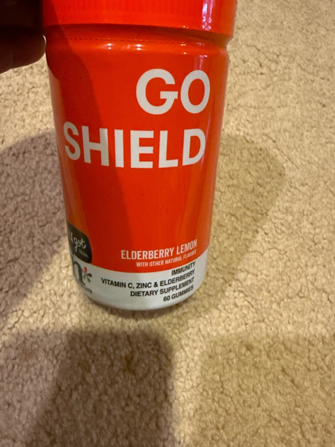 65I'm selling a container of Go Shield Elderberry Lemon flavored gummies! These are a dietary supplement with Vitamin C, Zinc & Elderberry for immunity. Each container has 60 gummies.