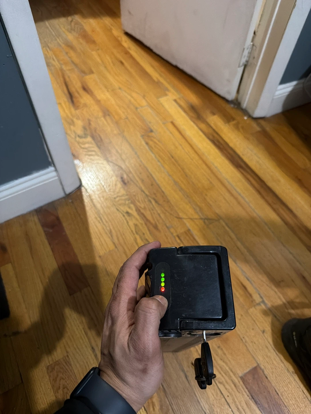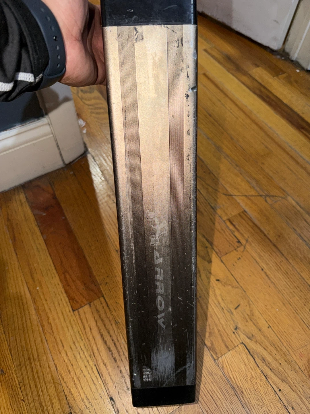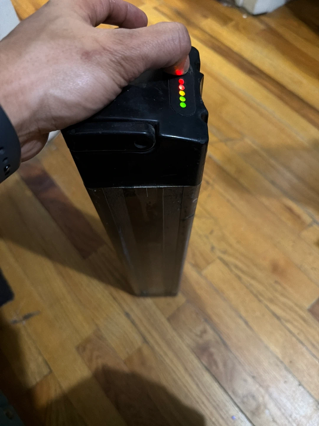 This is an Arrow brand electric bike battery pack. It's black with a silver body and ribbed texture. Features an LED charge indicator. Includes a key for locking.