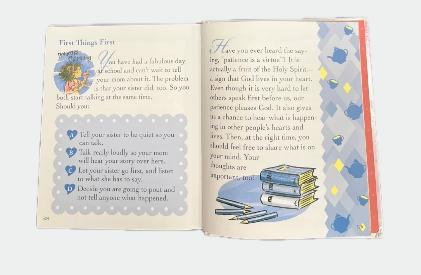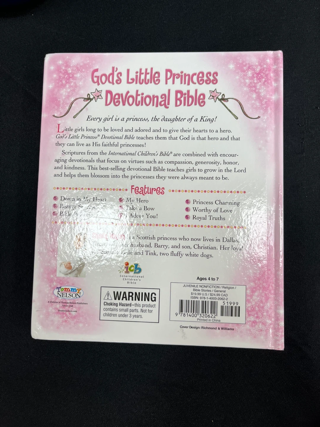 15This is a God's Little Princess Devotional Bible by Sheila Walsh. It is a book for girls aged 4 to 7. It contains scriptures from the International Children's Bible. It teaches girls to grow in the Lord and helps them blossom into the princesses they were always meant to be