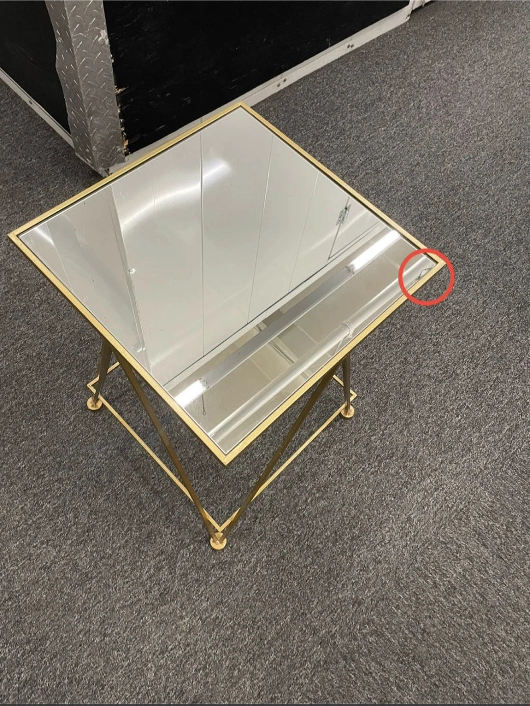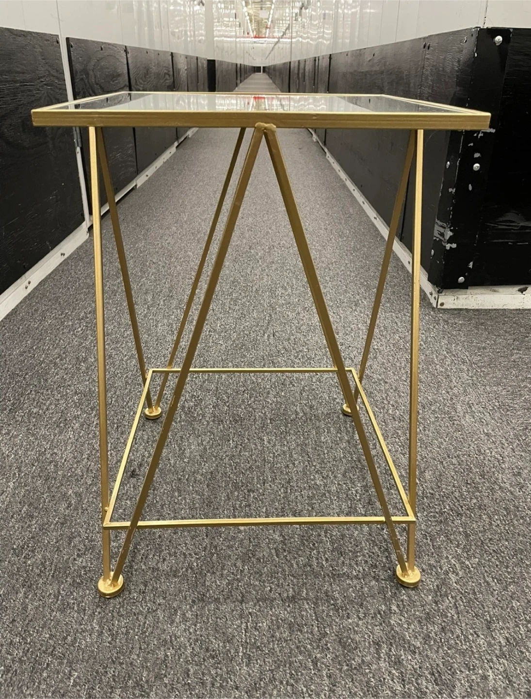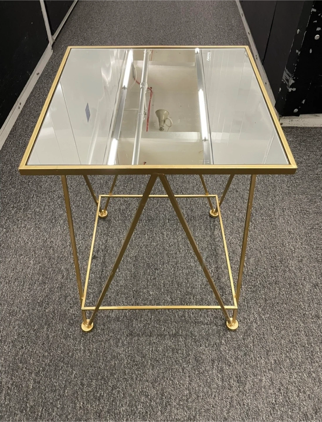 299Selling a stylish gold accent table featuring a sleek glass top. It's perfect for adding a touch of elegance to any room. There is a small crack on the glass top as shown in the pictures.