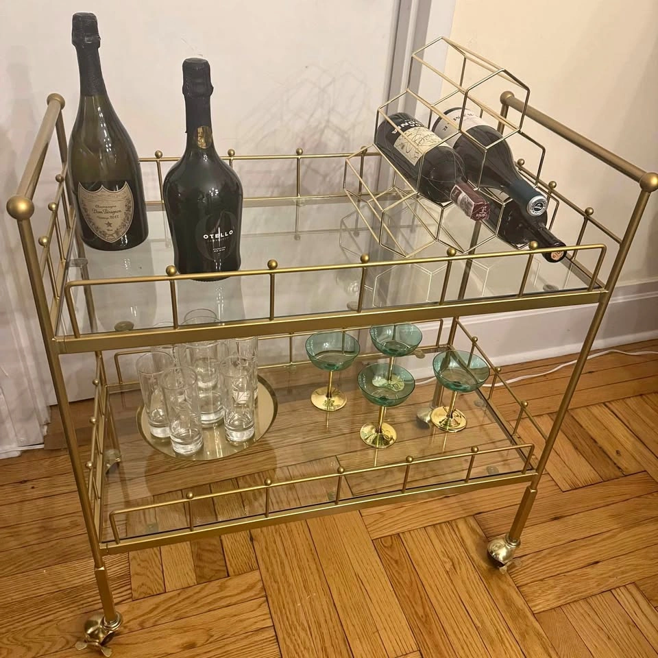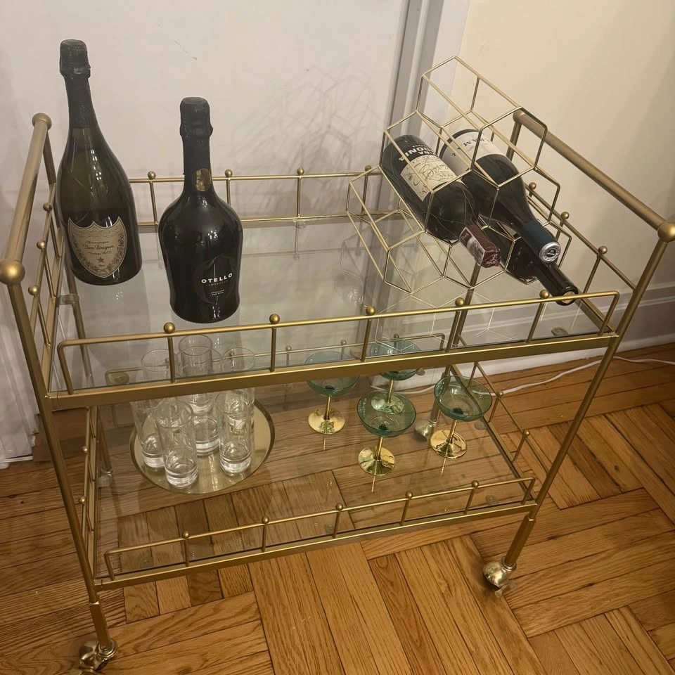 Sleek and functional gold bar cart featuring two glass shelves, and smooth-rolling caster wheels. Perfect for entertaining or stylish storage in your dining or living space. • Sturdy metal frame with gold finish • Two tempered glass tiers for display or storage • Easy to maneuver with locking wheels • Gently used, in excellent condition • Approx. dimensions: 30” W x 15” D x 31” H Accessories not included. Available for pickup. Like new. Paid $200