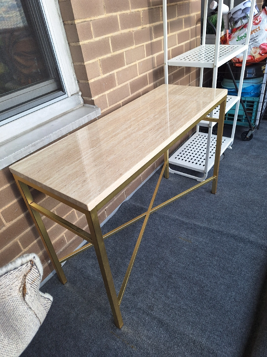 Selling a console table with a faux travertine top and gold-colored metal legs. It is BRAND NEW condition and would look lovely in an entryway or living room. The table has a sleek, modern design with an X-shaped support structure.