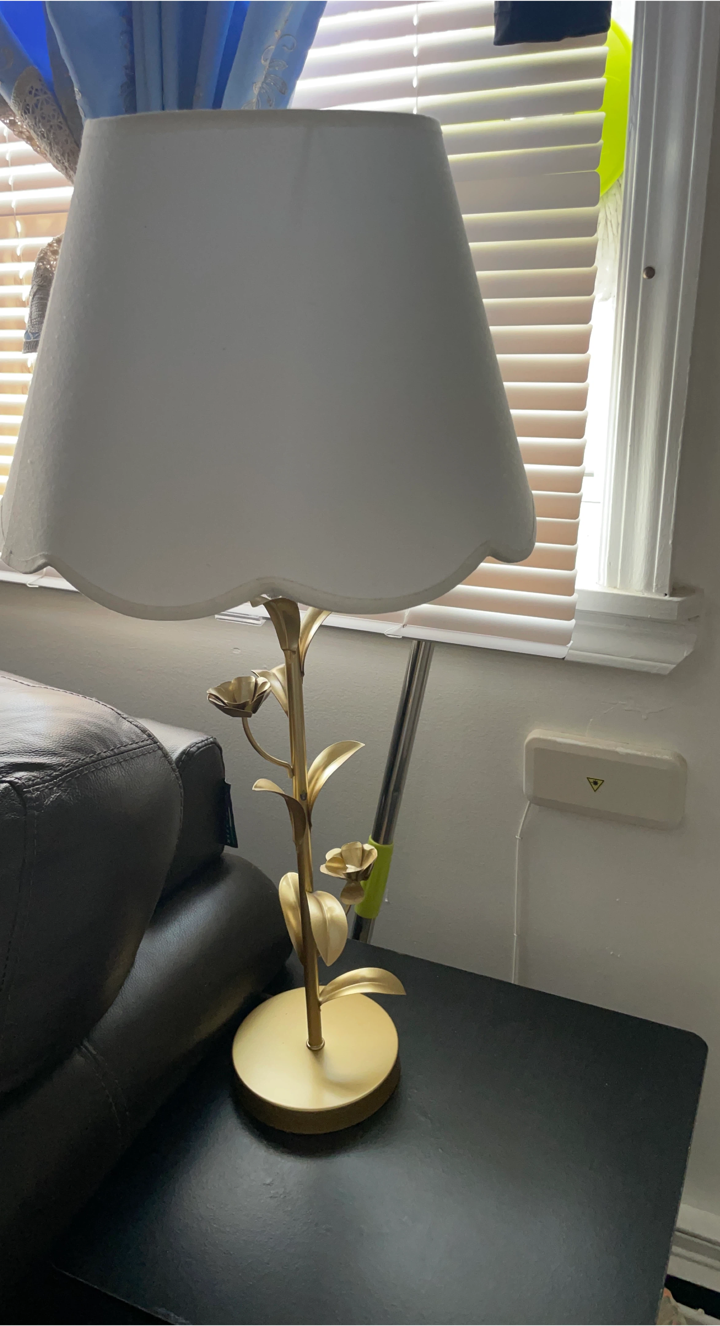 Selling 2 gold-colored table lamp with a floral design. The lampshade is white. It would look great on a bedside table or desk!