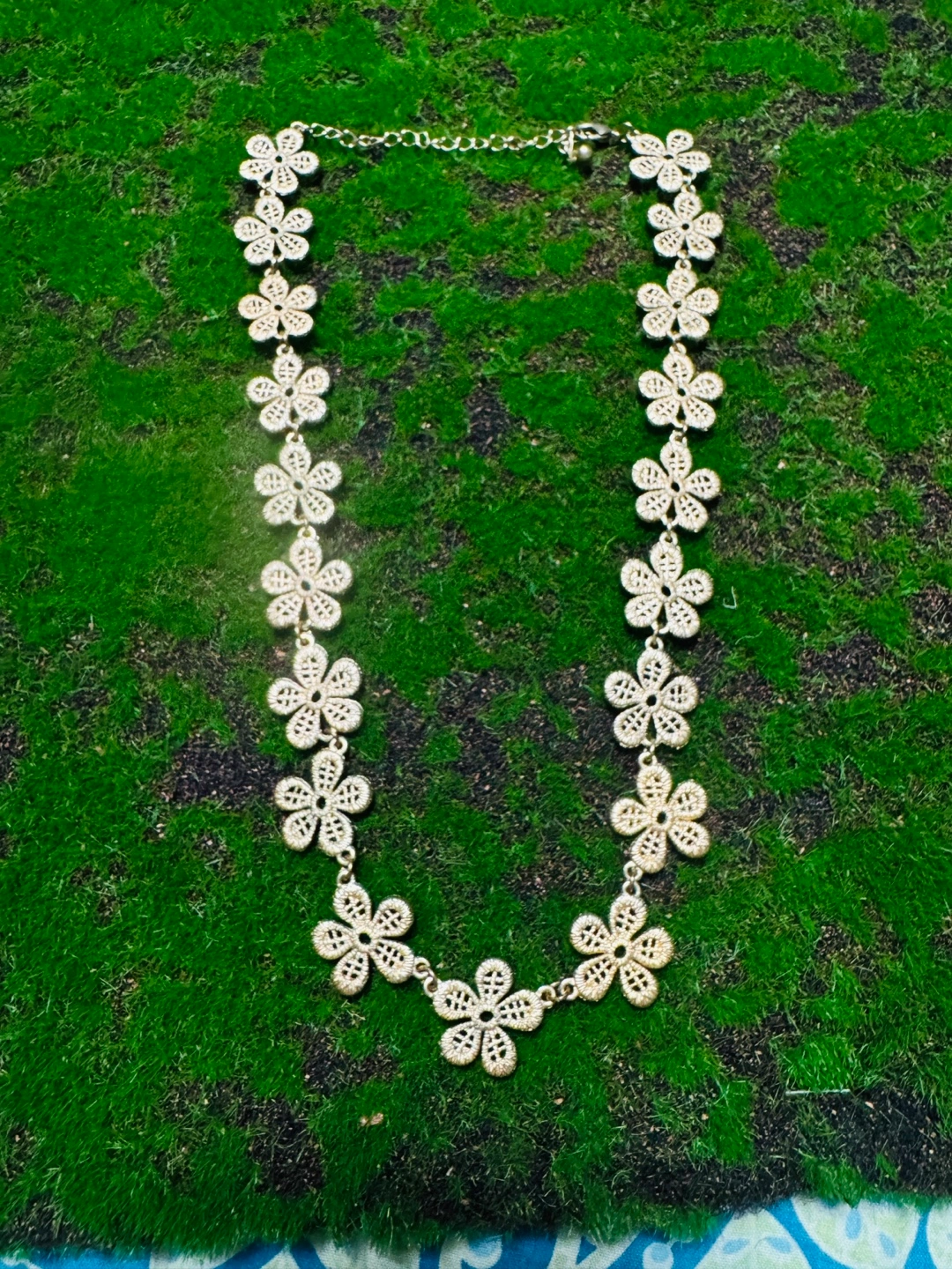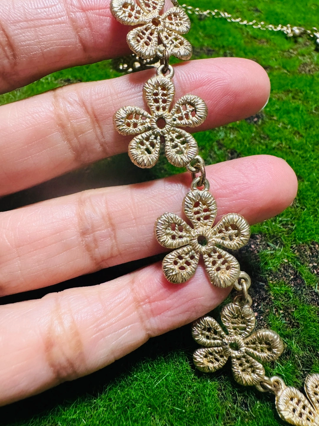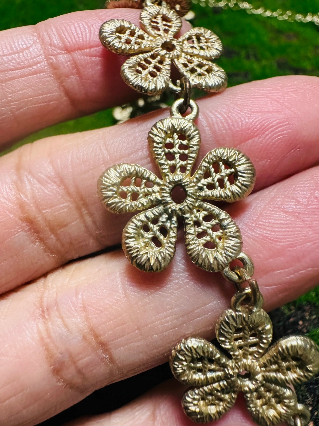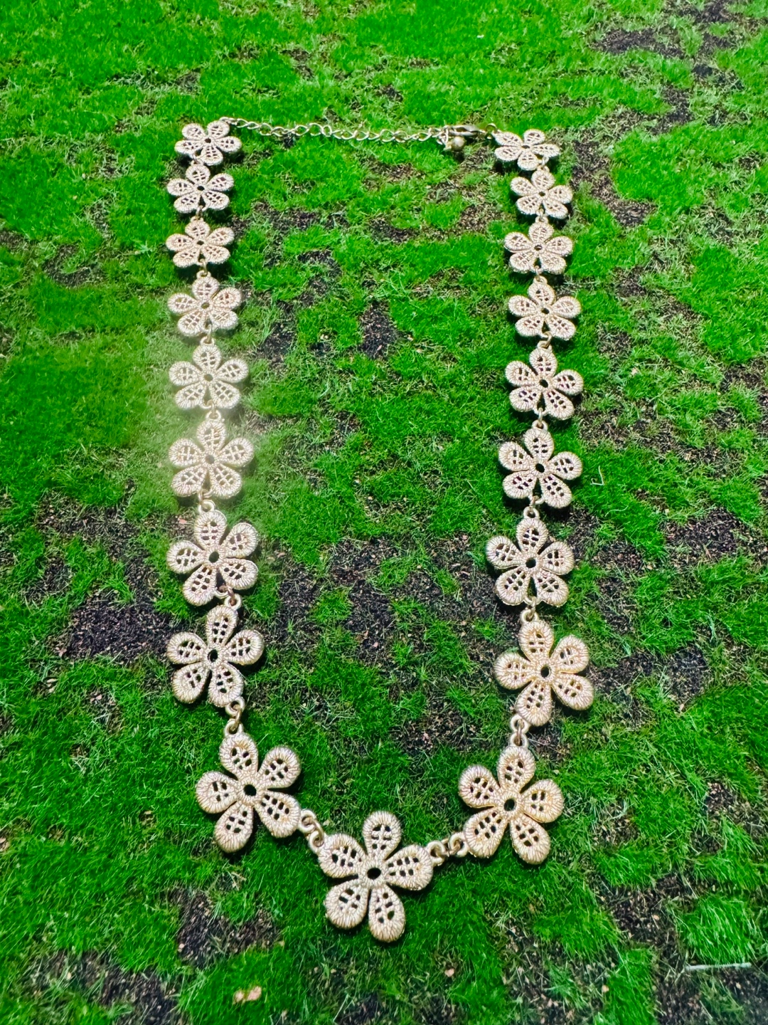 Selling a pretty gold-colored metal flower necklace! It's in great condition and would be a lovely accessory for any outfit.