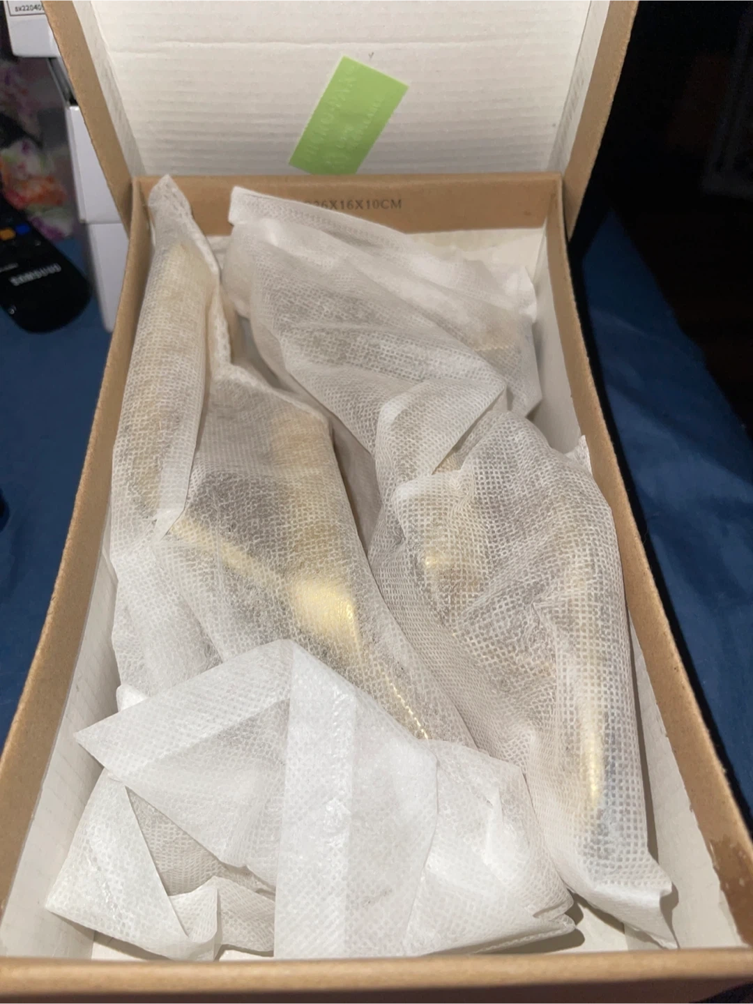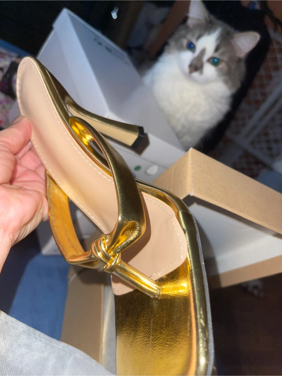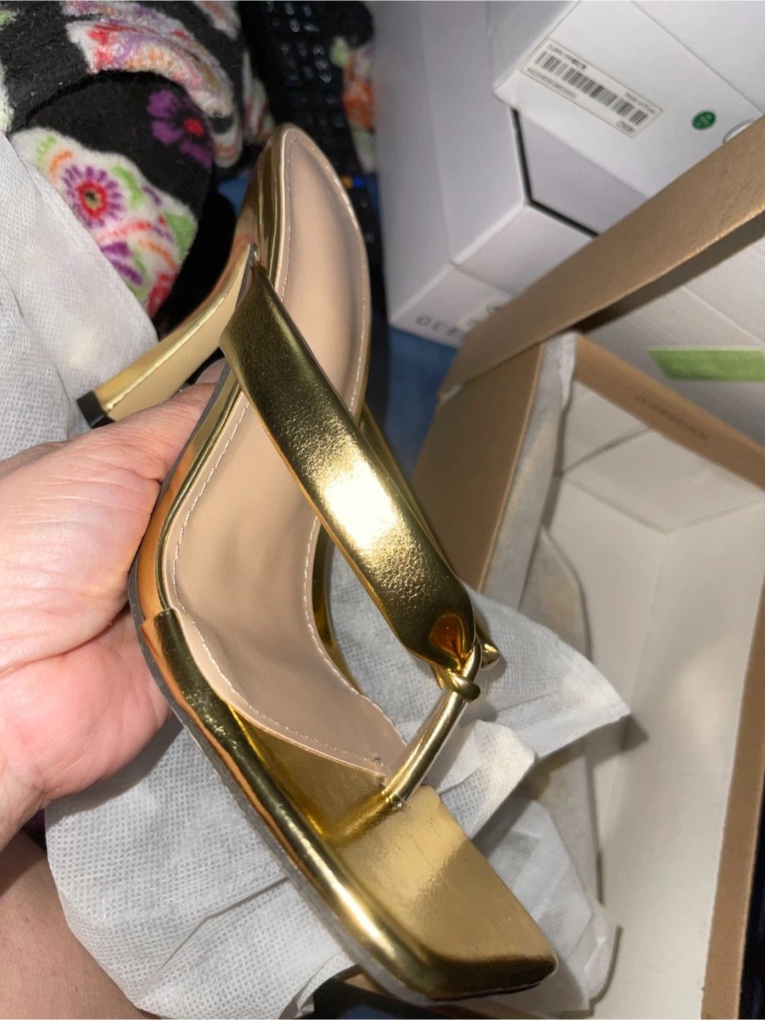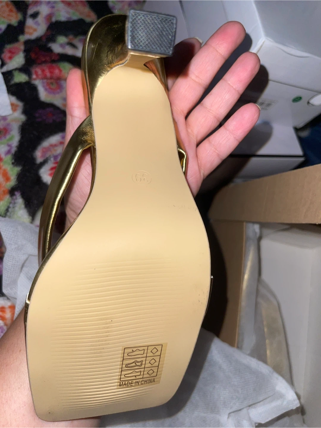 Selling a pair of gold heeled sandals. They come in the original box and are brand new condition. The size is 39. US 8.5