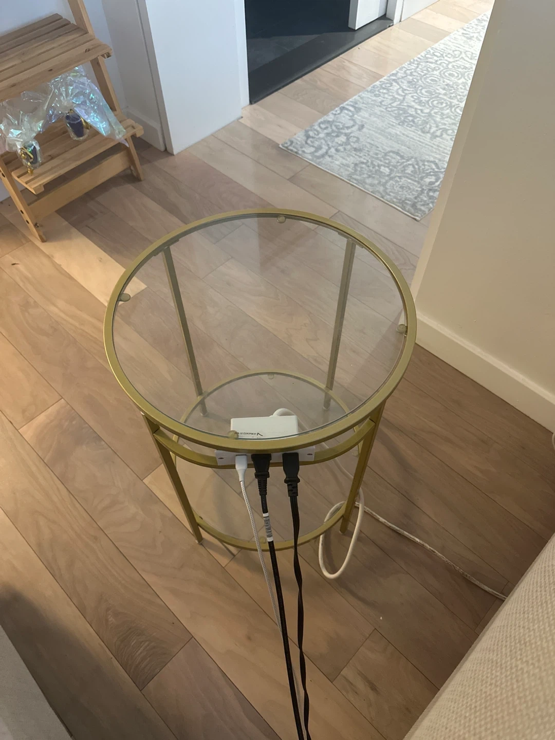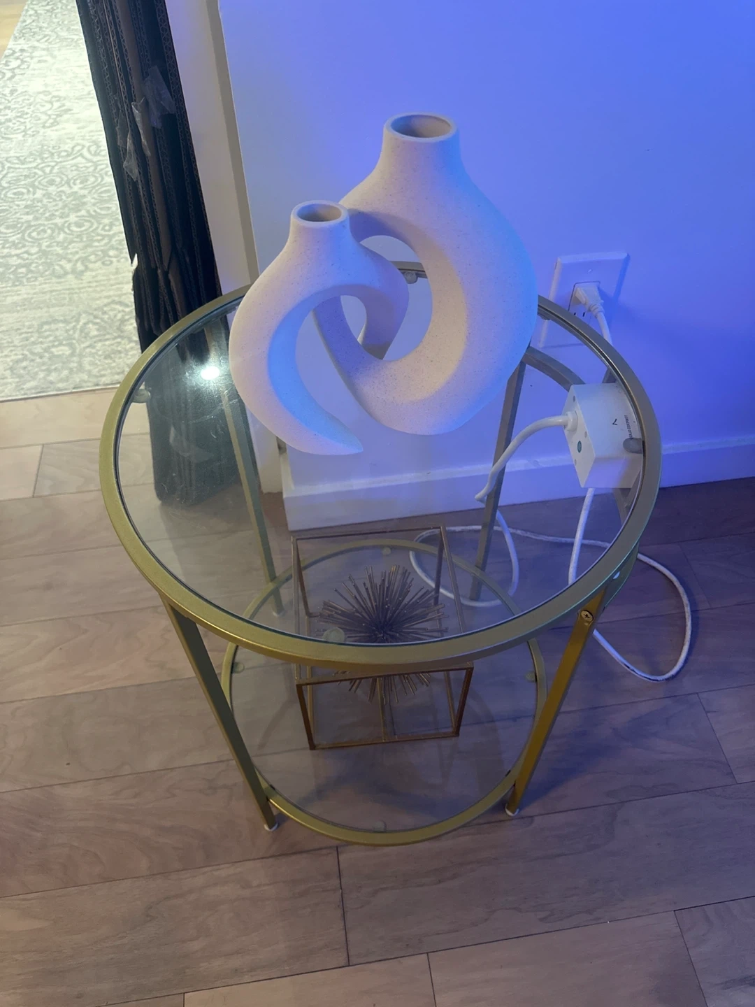 Selling a round accent table with a glass top and gold colored frame. It's in great condition and would look great in any living room or bedroom. It also has a convenient plug and USB so you can charge your phone or electronics. It has a second shelf underneath for extra storage or decor. Moving sale. Pick up please. Thank You!!