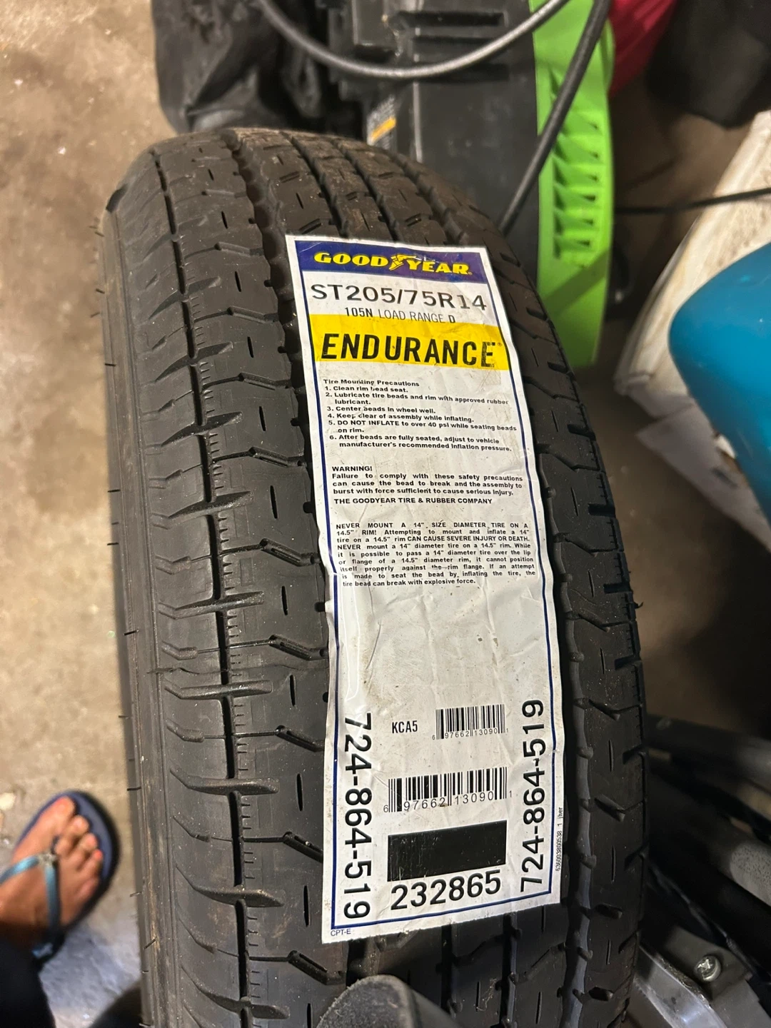 Selling a brand new Goodyear Endurance ST205/75R14 tire! This is a 105N load range D tire. It's ready for your trailer or vehicle. Feel free to reach out if you have any questions!