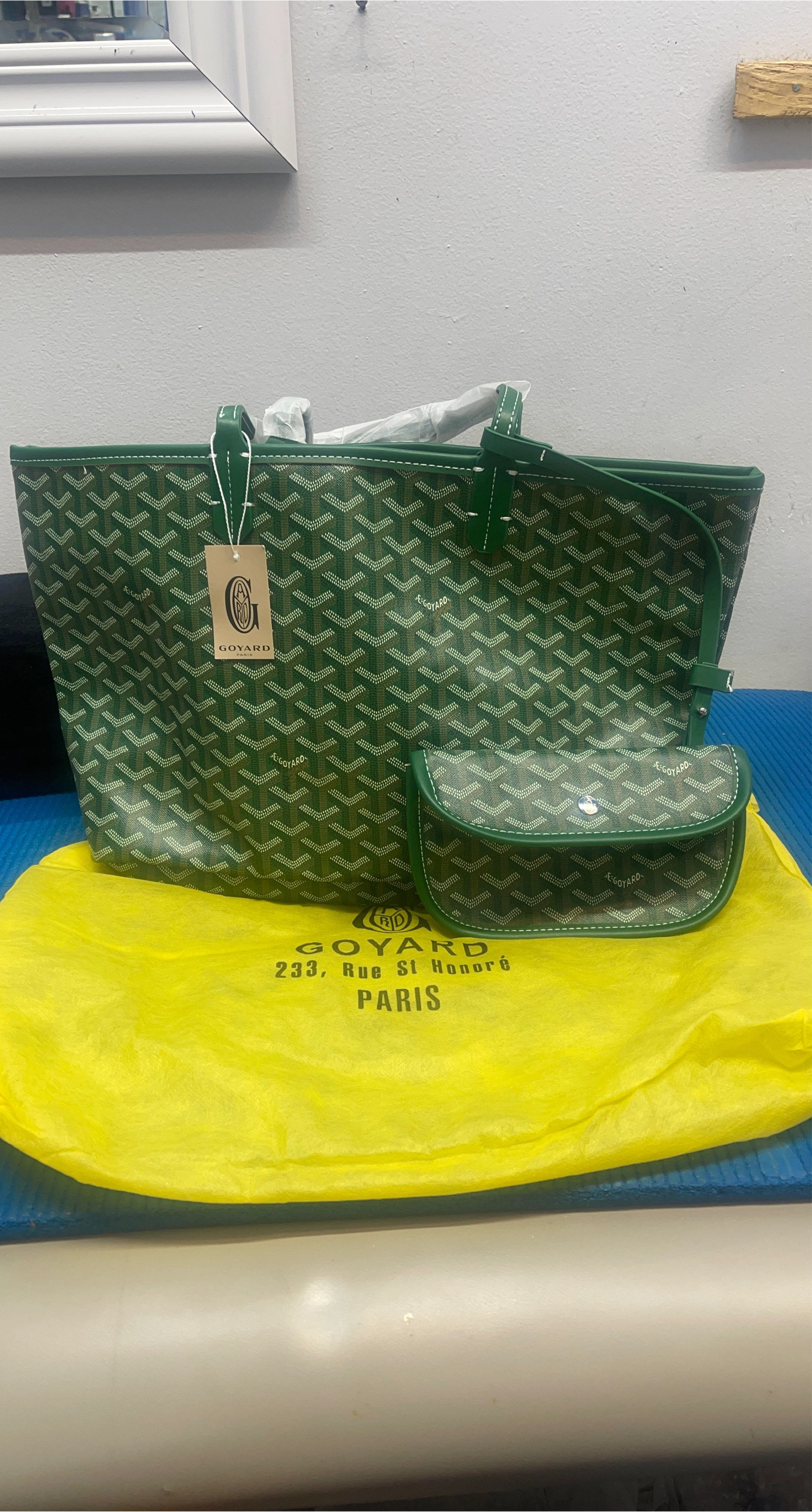Selling a beautiful Goyard tote bag in green, complete with a matching pouch. It comes with its original dust bag. This stylish set is perfect for everyday use or as a chic travel companion!