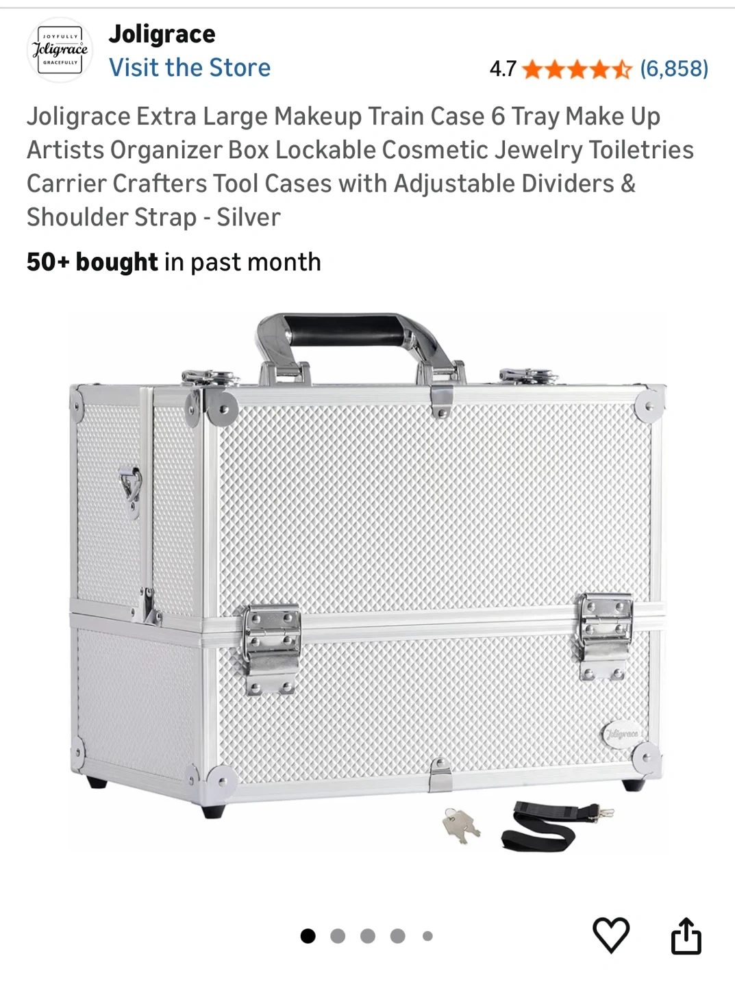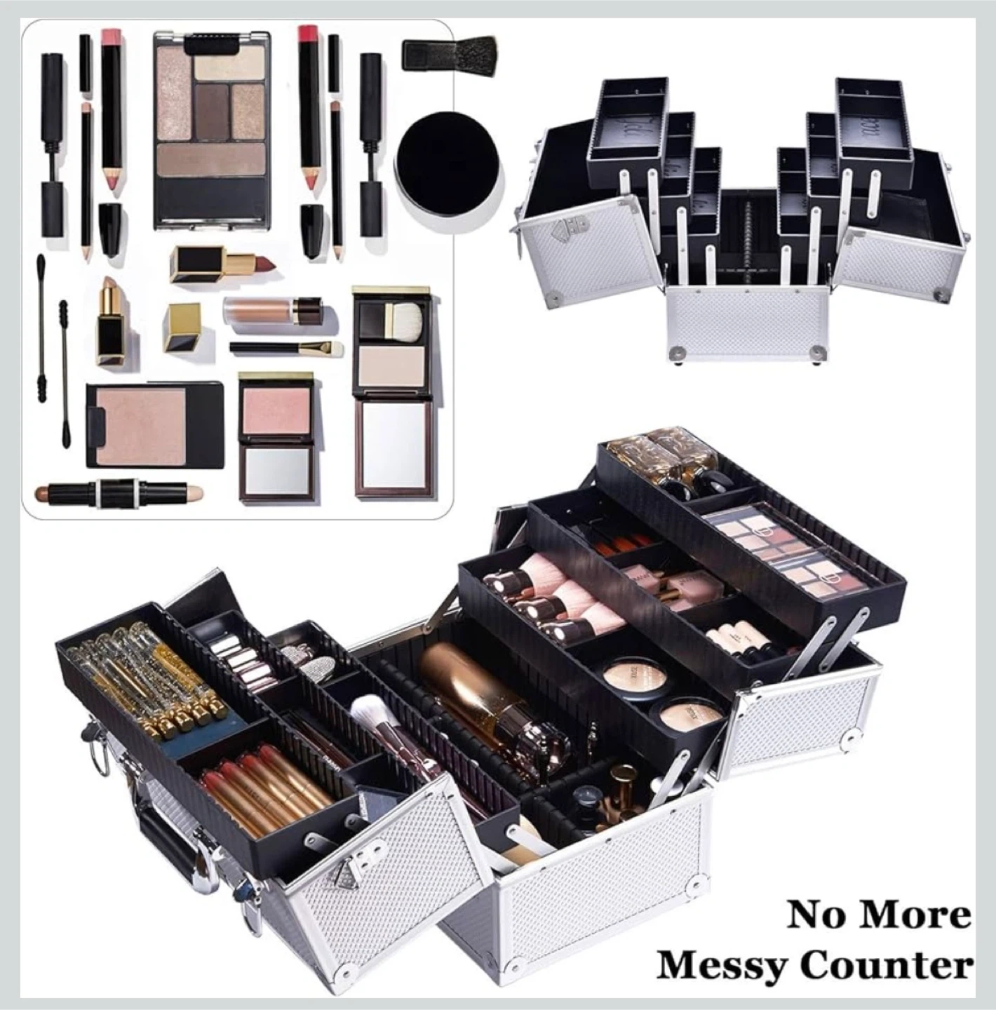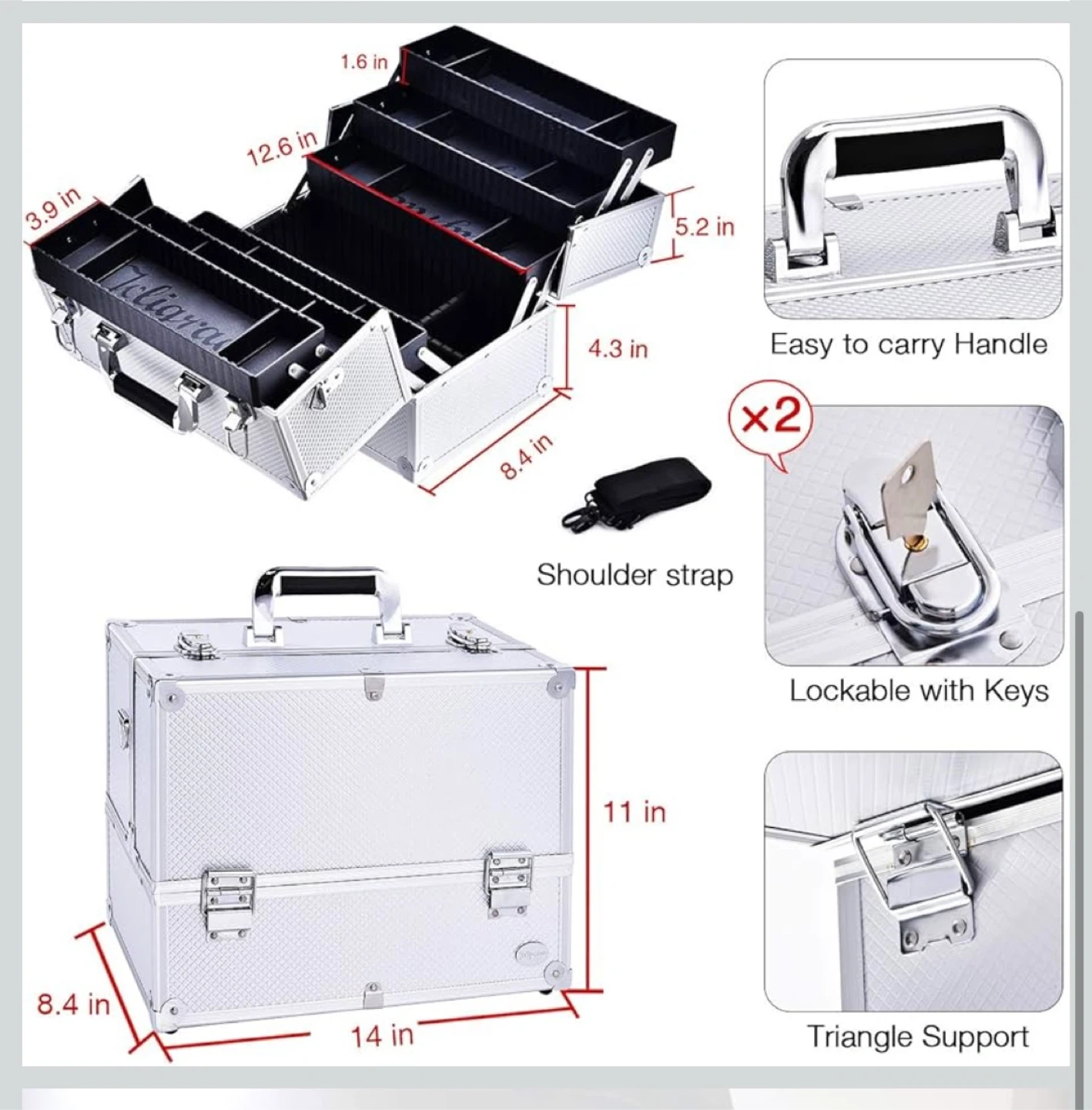 This makeup train case is extra large with six trays. It features a lockable design. The case has a silver finish and triangle support for durability.