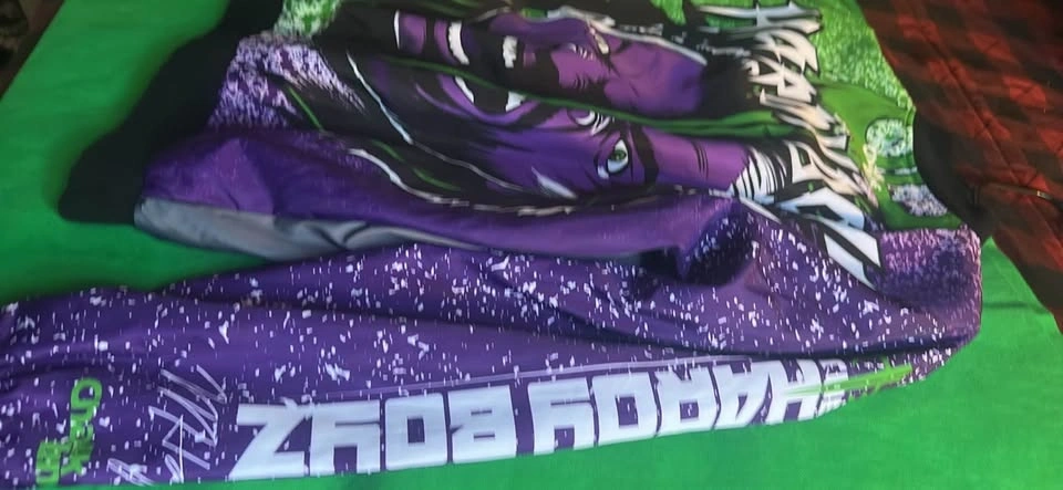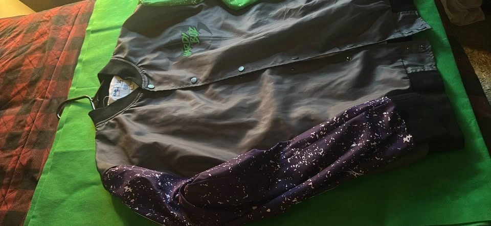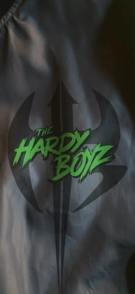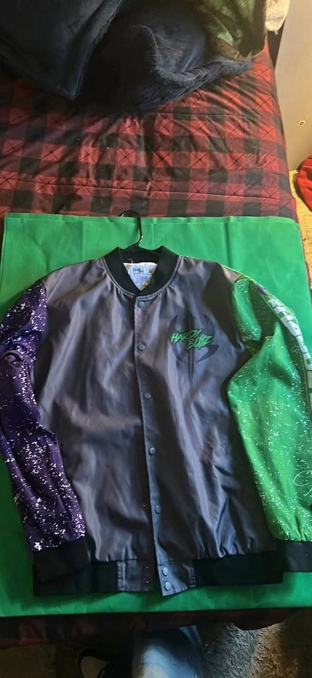 Awesome WWE Hardy Boyz bomber jacket. Has the Hardy Boyz logo on front. Gray body with cool purple and green splatter print sleeves. Snap button closure.