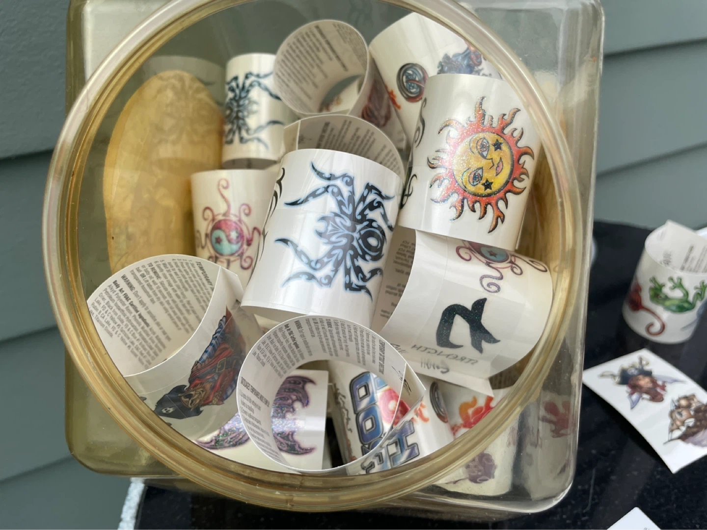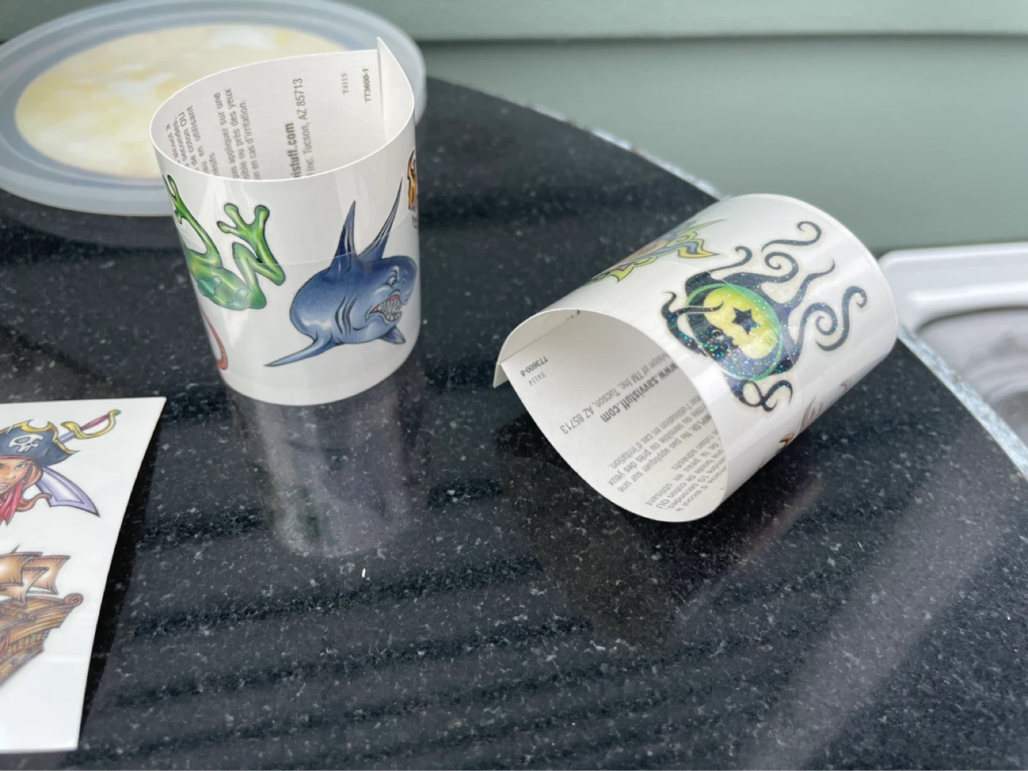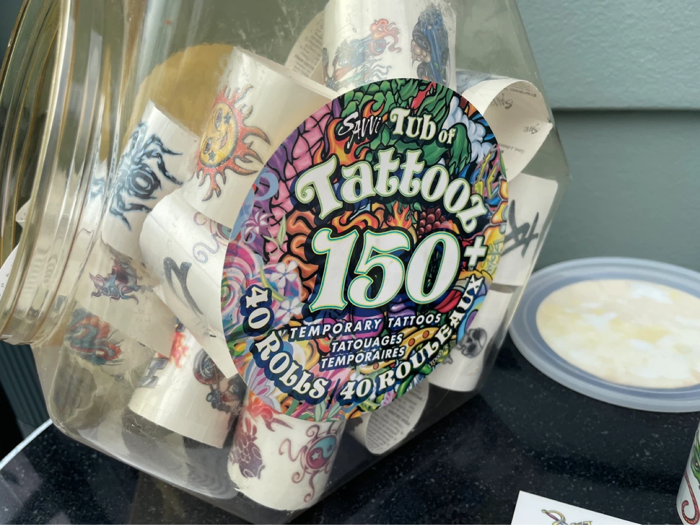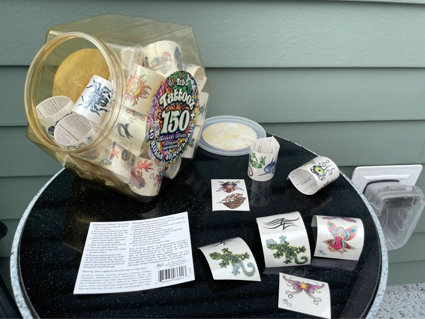 This tub contains 139 of 150 temporary tattoos on 40 rolls, featuring a variety of fun designs like suns, fairies, lizards, and pirates. They're easy to apply and remove, perfect for parties or dress-up! Great for kids who love to express themselves.