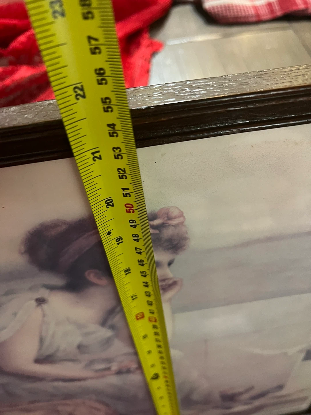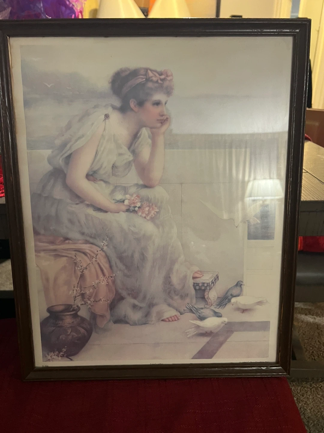 This framed art print features a classic depiction of a woman with pigeons. The frame is dark brown, and the print itself is a pastel scene. Its dimensions are approximately 39 inches tall by 28 inches wide. It's a lovely piece for any home decor setting!