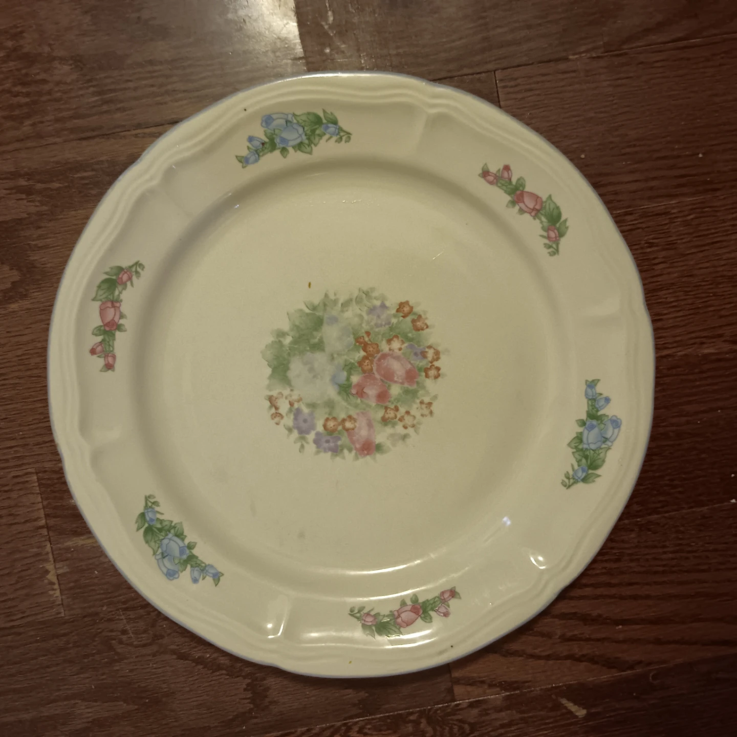 This is a vintage dinner plate with a delicate floral pattern. It features a cream base with blue and pink floral accents along the scalloped edge and a central bouquet design. Dishwasher safe.