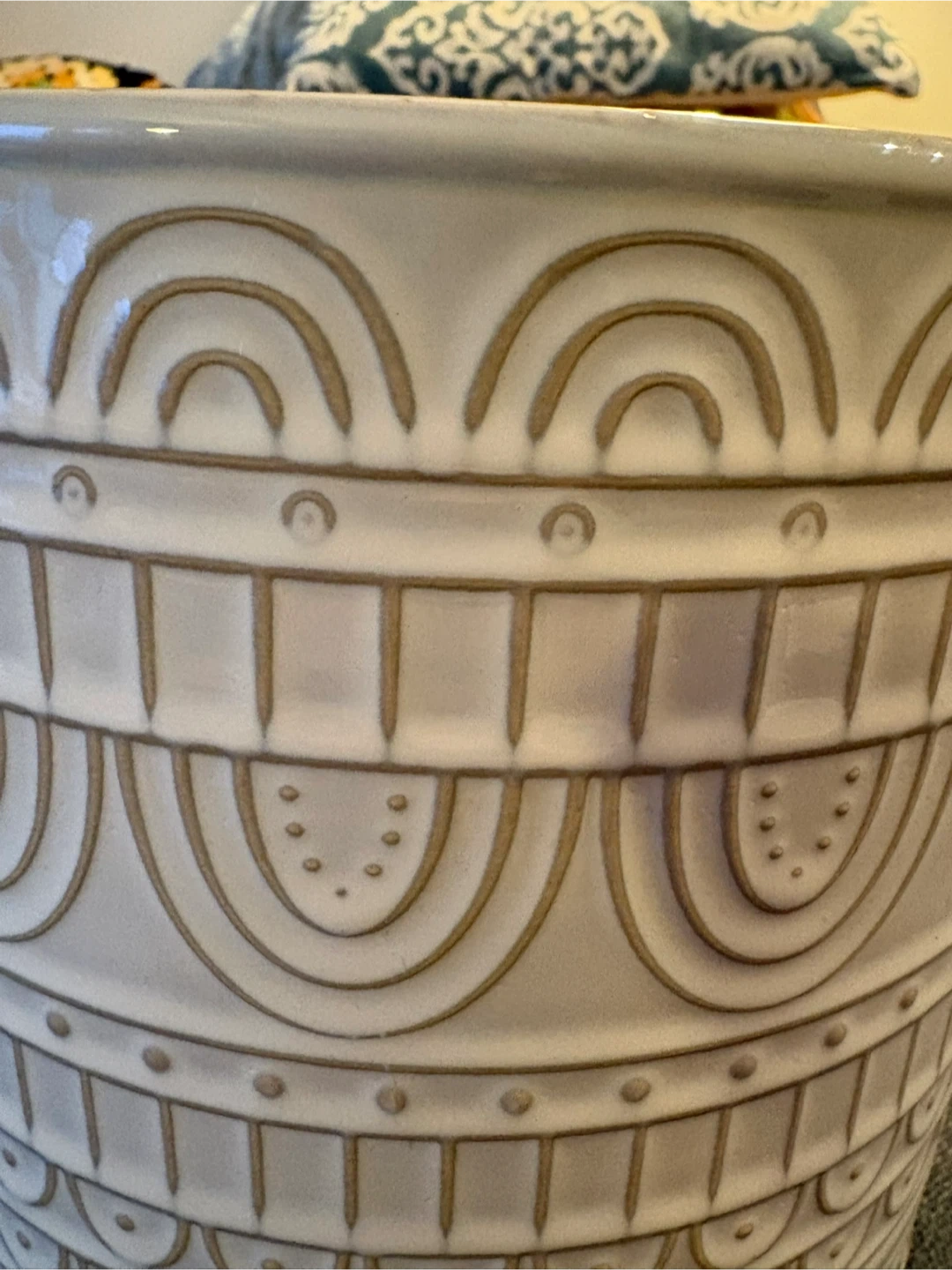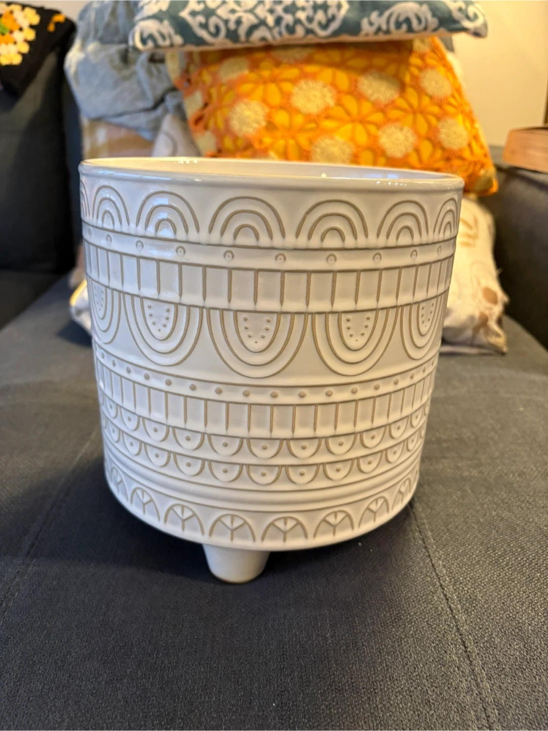 Large white beautiful plant pot 7.5 inches in diameter. Light wear and slight discolouration inside on the bottom. Stand on three little legs. Pickup at Sherbourne and Adelaide St East or sometimes at some TTC stations.