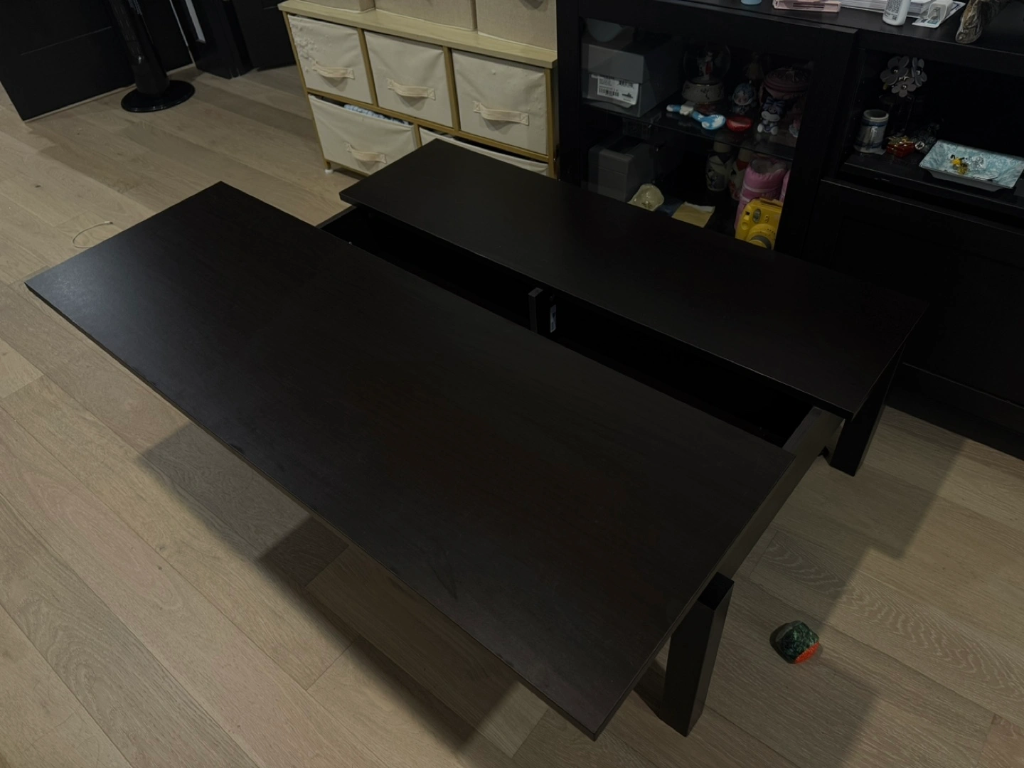 Dark brown coffee table. Extends to a larger size. Features hidden storage underneath. Simple, modern design. Perfect for small spaces.